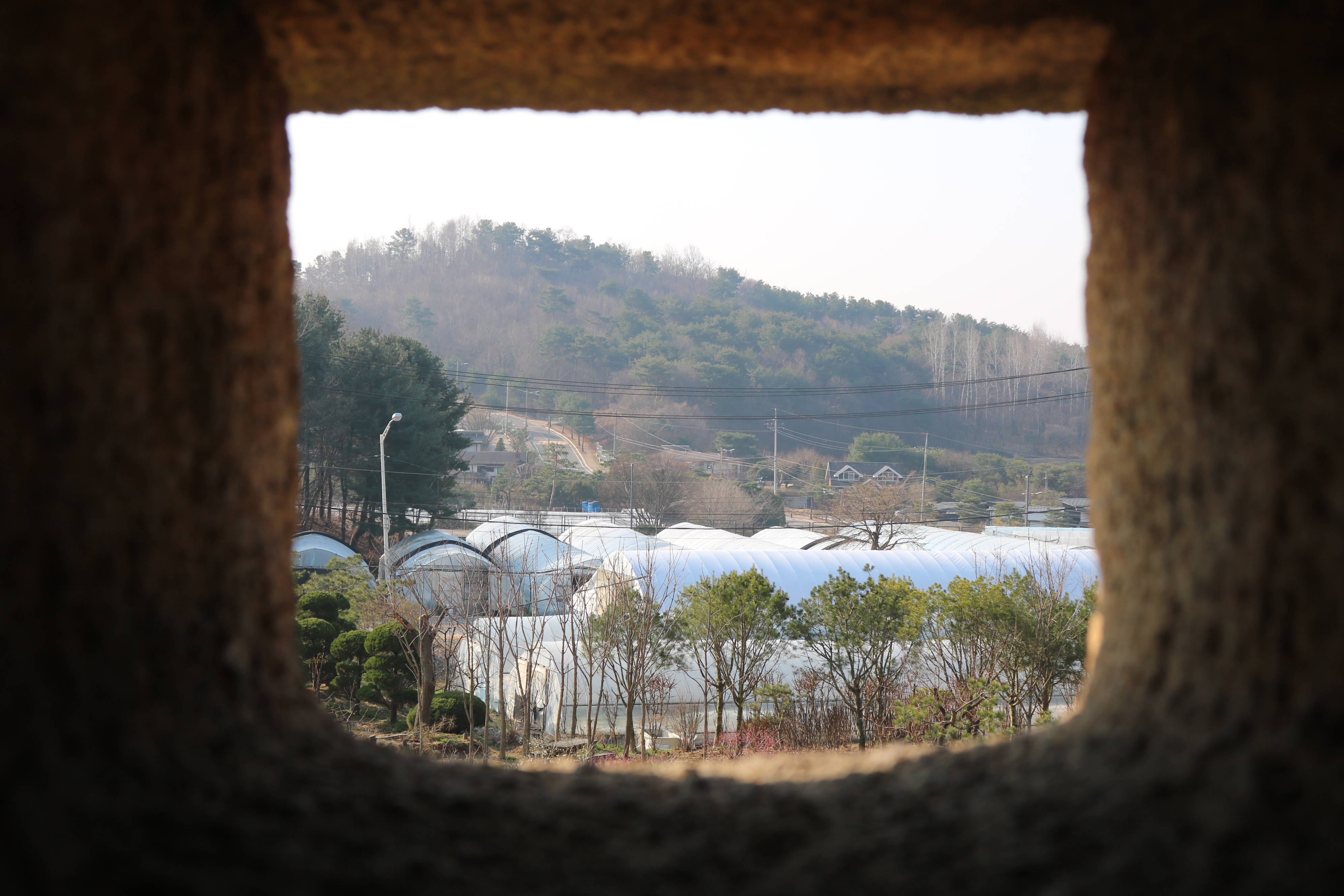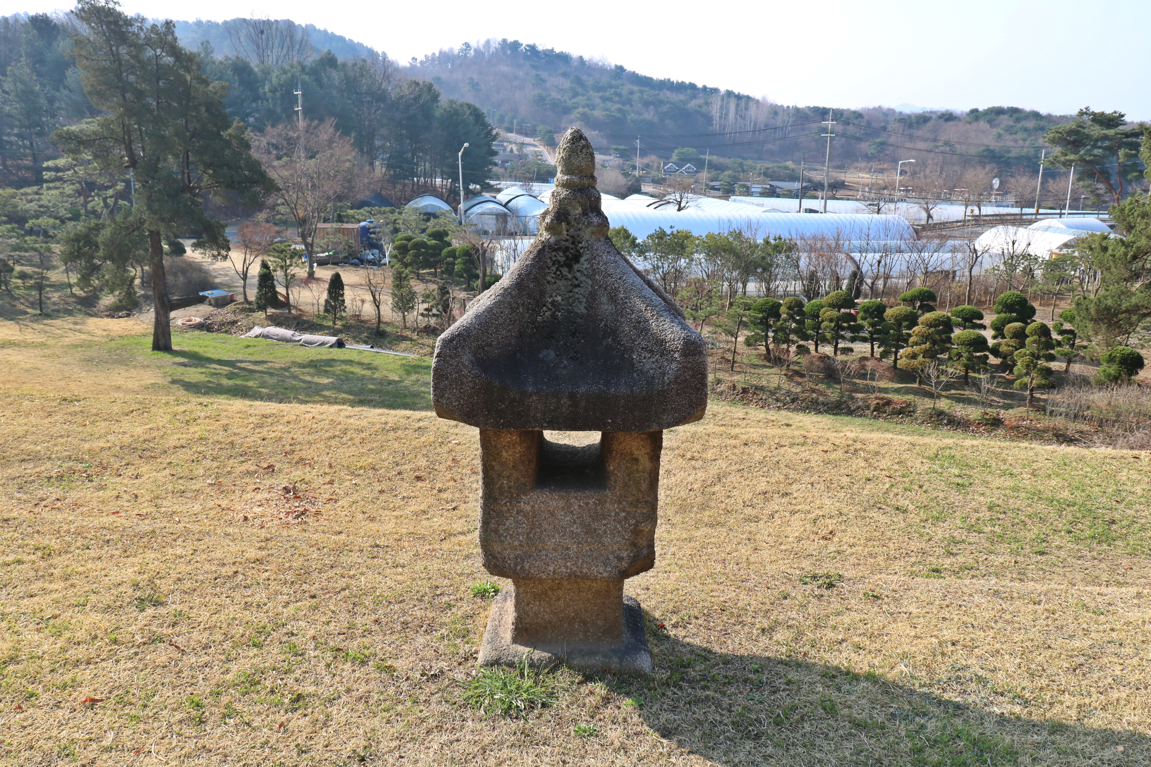 한확 묘의 장명등을 보니 매우 큽니다. 왕릉에 있는 장명등만큼 크네요. 조선 시대에는 왕이나 세력가의 무덤 즉, 정 3품 이상 관리의 무덤 앞 장명등이 설치되었습니다. 장명등 큰 구멍을 통해 능내리 마을이 보입니다.