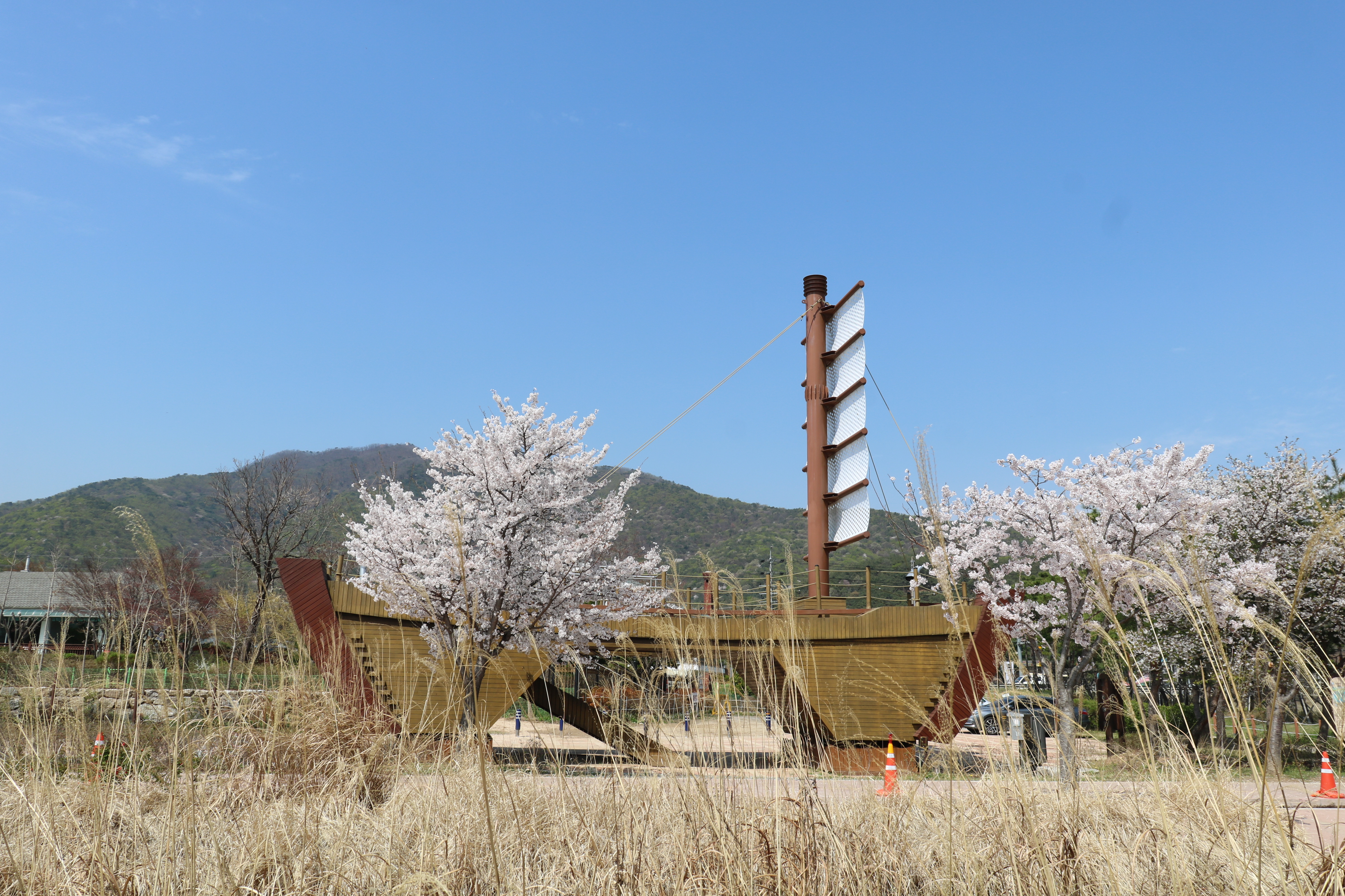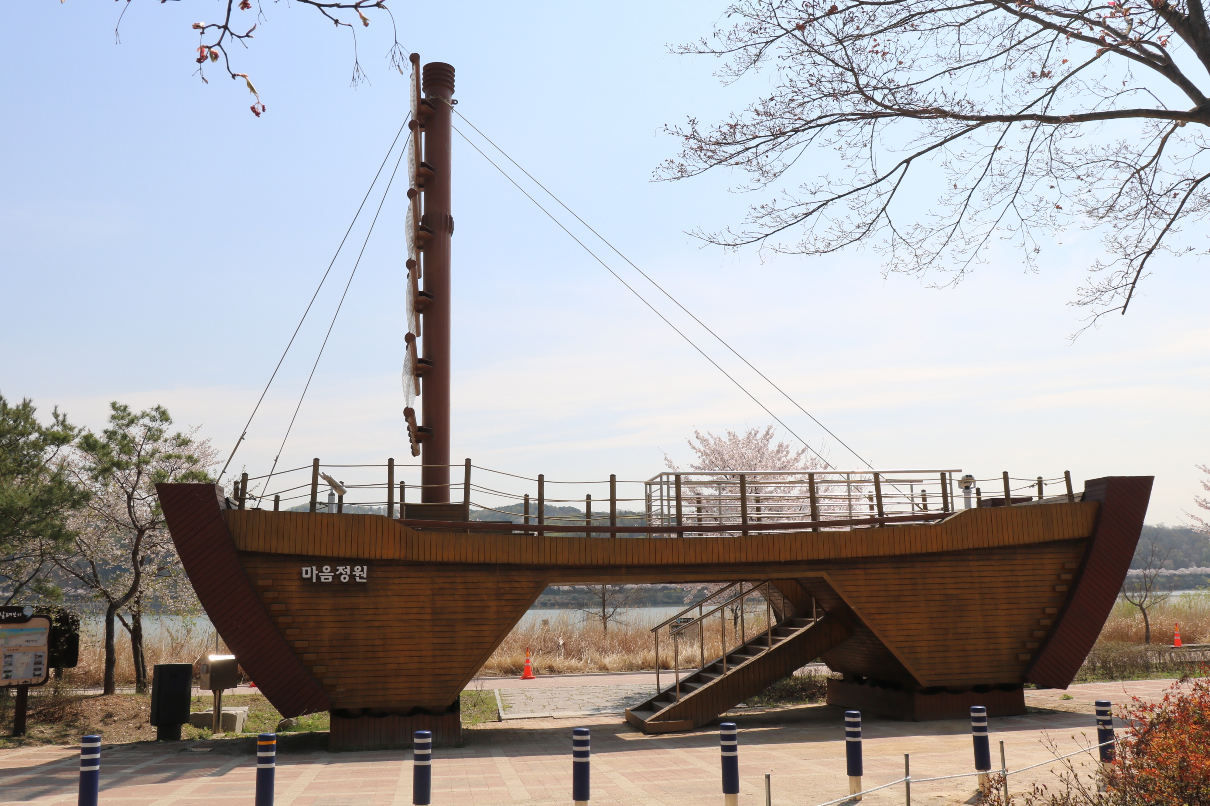 아주 큰 모형 배 한 척이 있습니다. 여긴 마음정원의 상징이며 포토존입니다. 배 위에 올라가 노 젓는 뱃사공처럼 북한강을 바라다 볼 수 있습니다. 배 위에서 강 건너를 볼 수 있는 망원경도 있습니다. 망원경 사용은 무료입니다. 망원경을 강 건너를 보니 벚꽃이 만개한 모습이 보입니다.