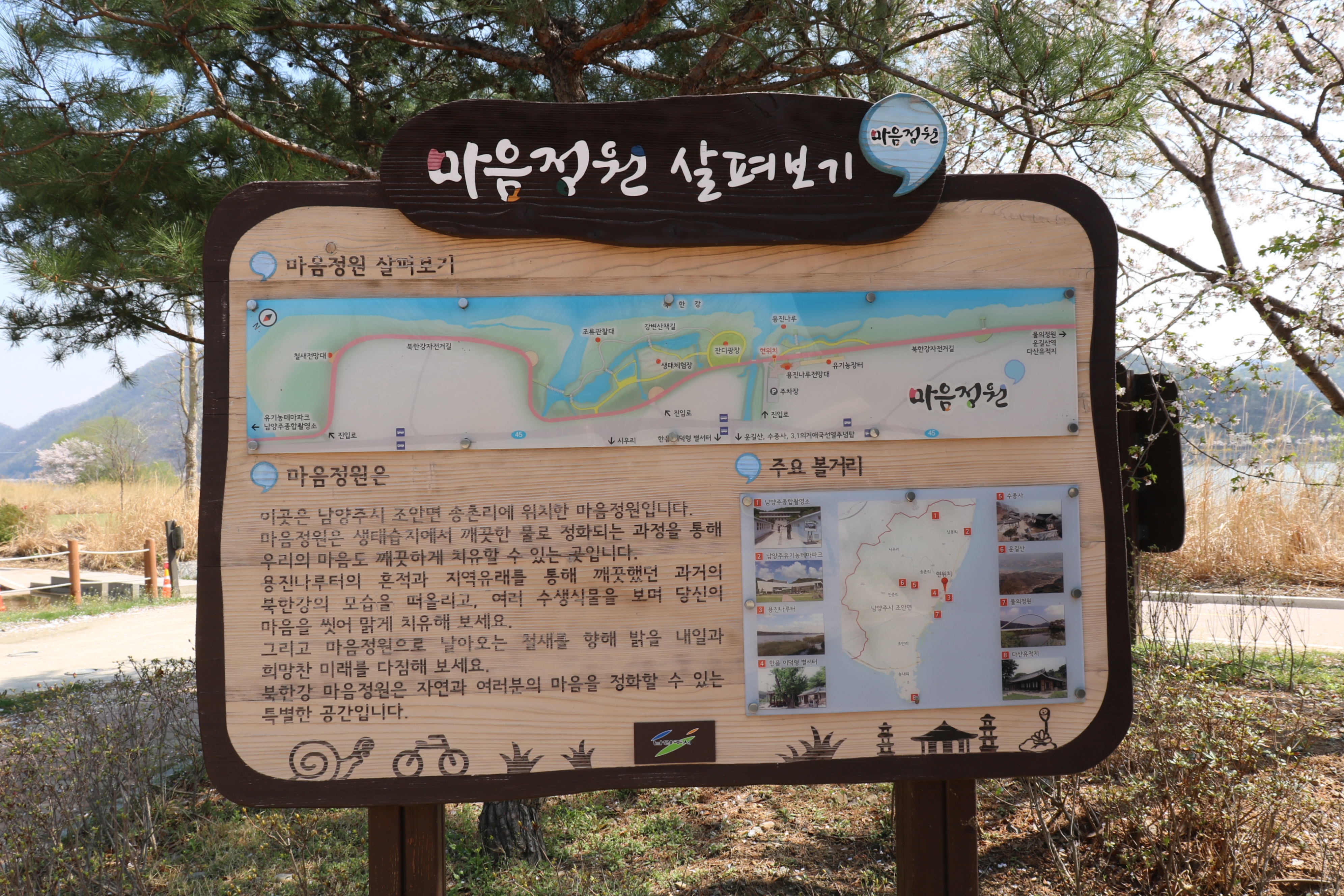 마음정원 안내판을 보니 생태체험장, 강변 산책길, 조류관찰대 그리고 춘천으로 이어지는 북한강 자전거길이 있습니다. 그리고 물의정원과 이어집니다. 마음정원 곳곳에는 오래된 고목들이 많습니다. 봄이지만 벌써 한낮 기온이 20도를 웃돌아서 덥습니다. 나무들이 본격적으로 푸르러지기 시작하면서 그늘이 생겼습니다. 북한강 변 나무 아래에서 잠시 쉬면서 멍 때리는 것도 좋습니다.