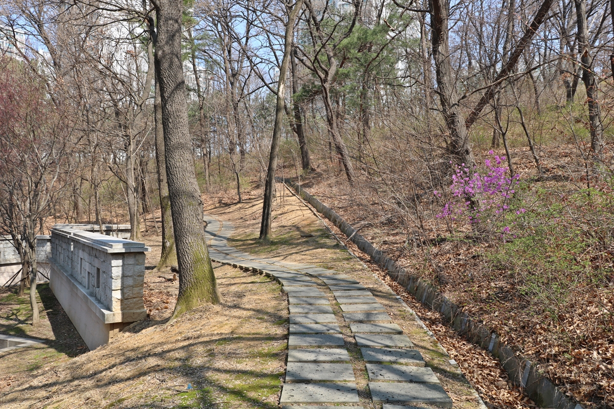 전통공원 뒤에 야산으로 이어지는 산책코스도 있습니다. 공원 뒤 산책로를 걷다 보니 미니 화성도 있고요, 화성 옆으로 진달래가 피었습니다.