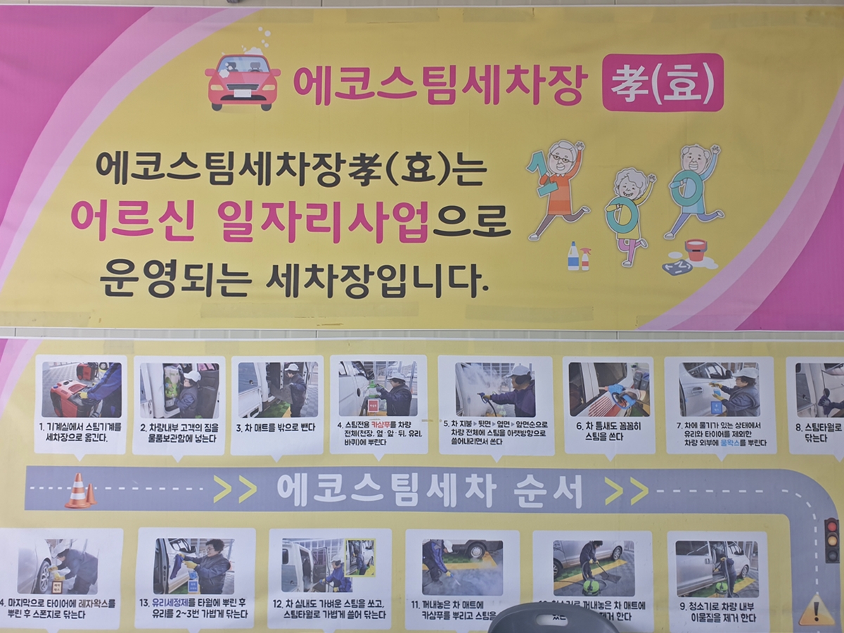 어르신들에게는 일자리, 소비자들에게는 저렴하고 좋은 세차 서비스를 제공하는 에코스팀 세차장 효(孝)! 최고의 세차 서비스를 제공하는 에코스팀 세차장 효(孝)에 많은 응원과 방문 부탁드립니다.