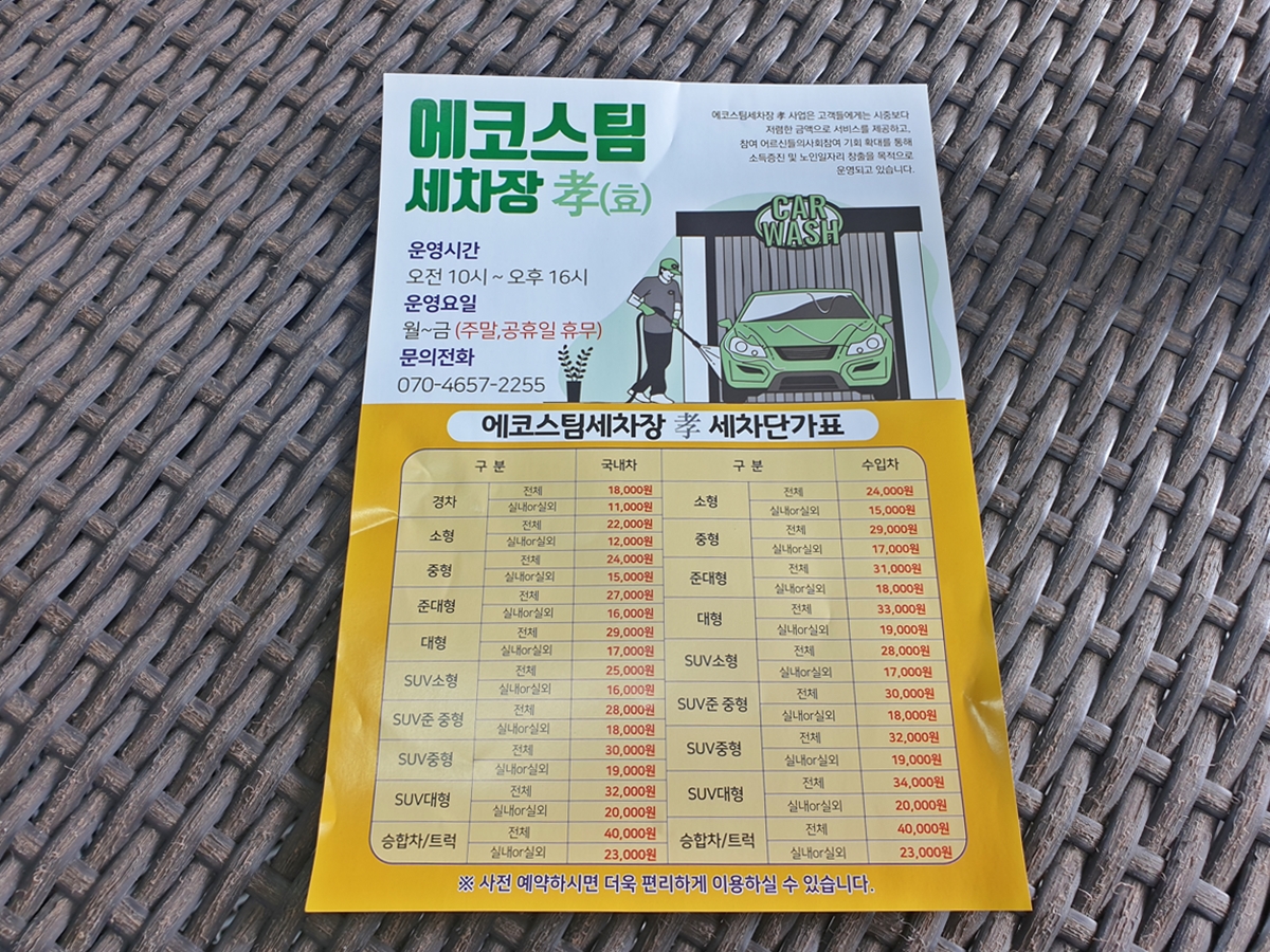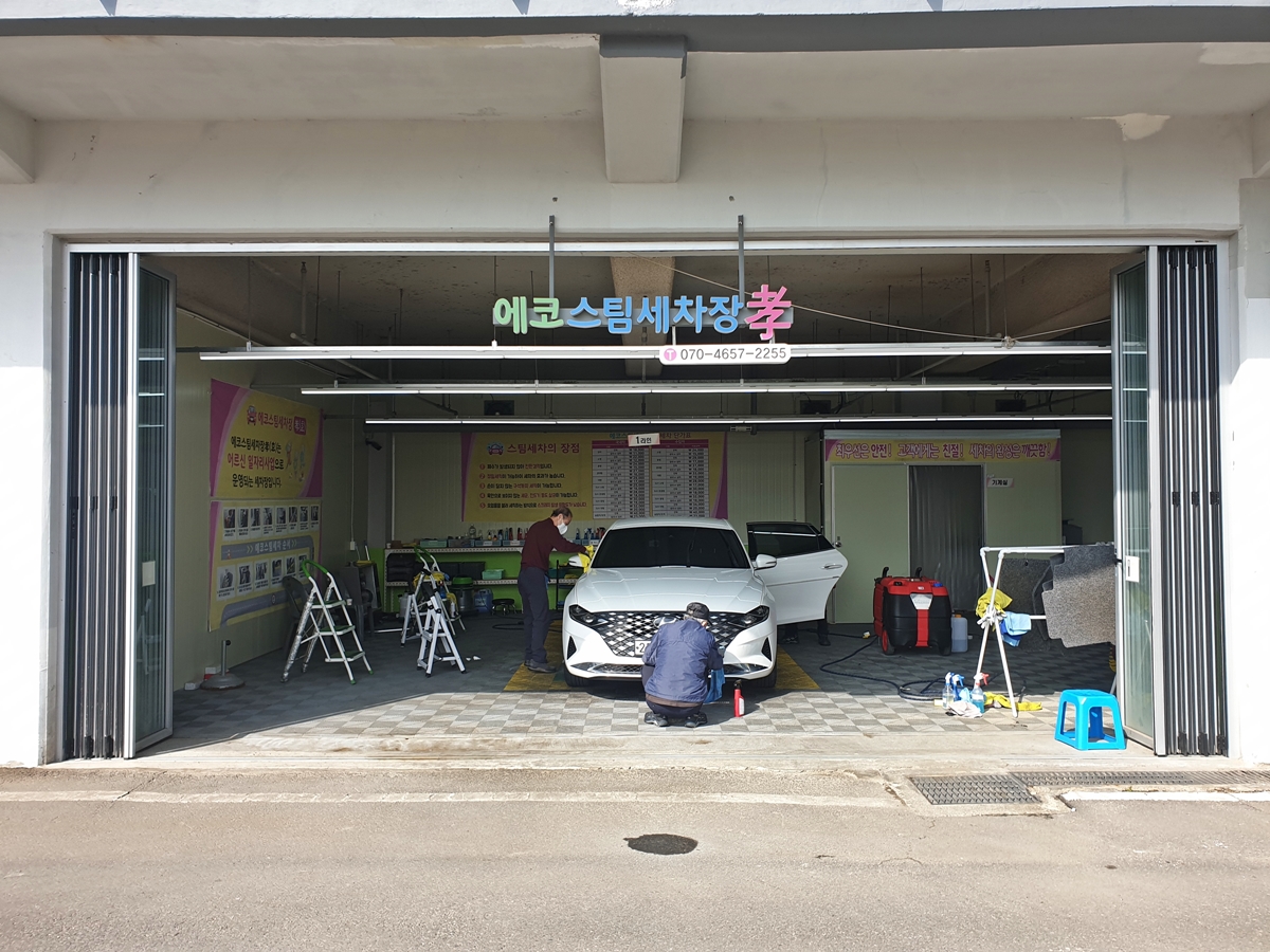 지하로 들어가서 왼쪽 태교음악당 주차장으로 가면 세차장이 있습니다. 세차장 앞에도 ‘에코스팀 세차장 孝’ 간판이 있습니다. 제가 방문해보니 나이 지긋한 어르신들이 차를 열심히 닦고 있었습니다.