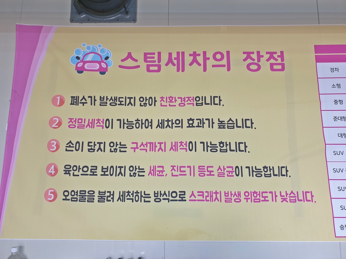 세차장 안 벽면에 스팀세차의 장점이 있네요. 친환경적인 게 마음에 듭니다.