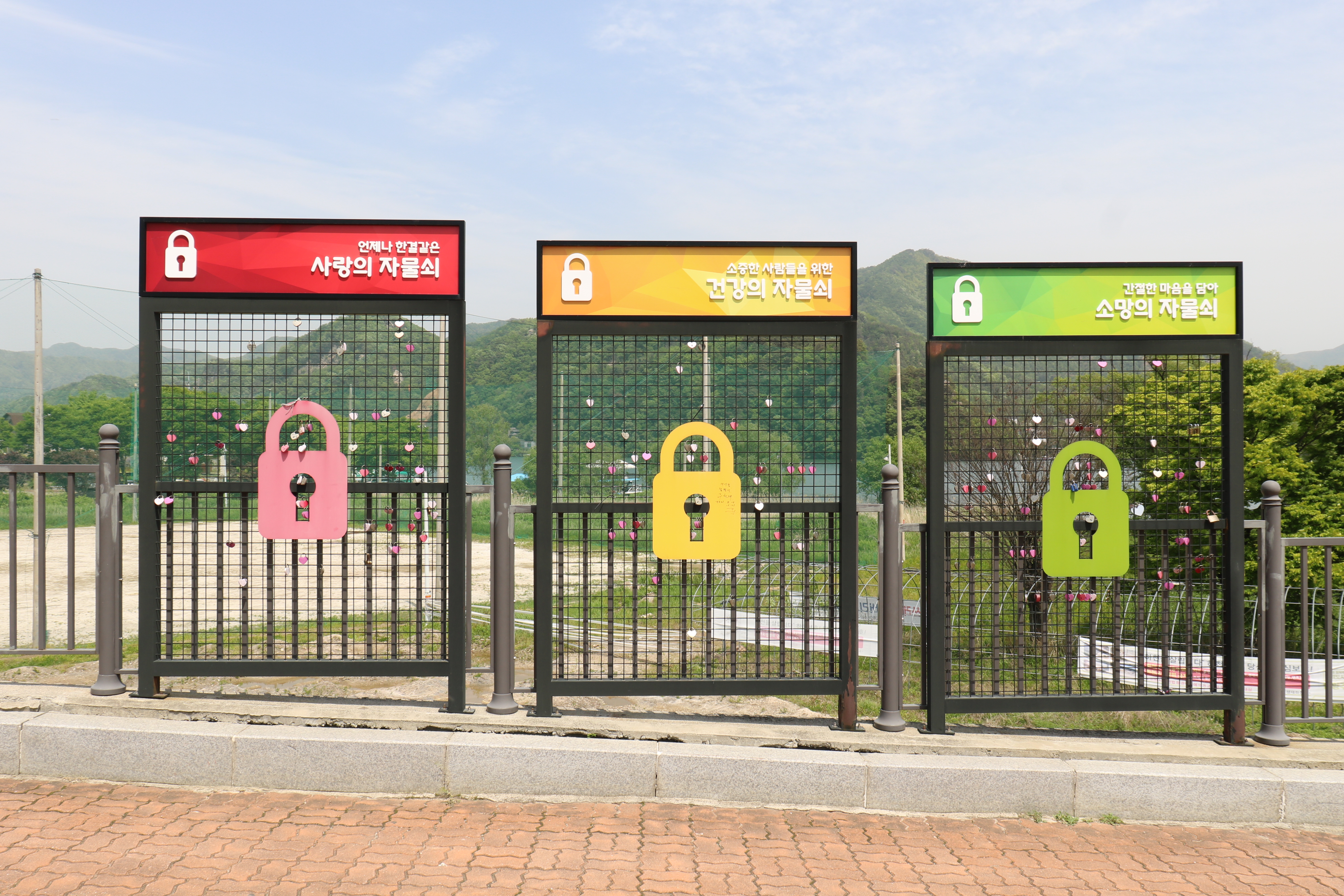 문학비 우측에 세 가지의 자물쇠도 있습니다. 사랑, 건강, 소망입니다. 여러분은 어떤 자물쇠를 채우고 싶은가요? 연애하는 젊은 청춘이라면 사랑, 중장년이라면 건강을 생각하겠지요. 저는 욕심이 많아서 사랑, 건강, 소망 자물쇠 모두 채우고 싶습니다. 여기서 소망이라면 지금처럼 행복하게 살 수 있게 해달라는 겁니다. 세 가지 자물쇠 중에서 소망 자물쇠에 가장 많은 자물쇠가 걸려 있습니다.