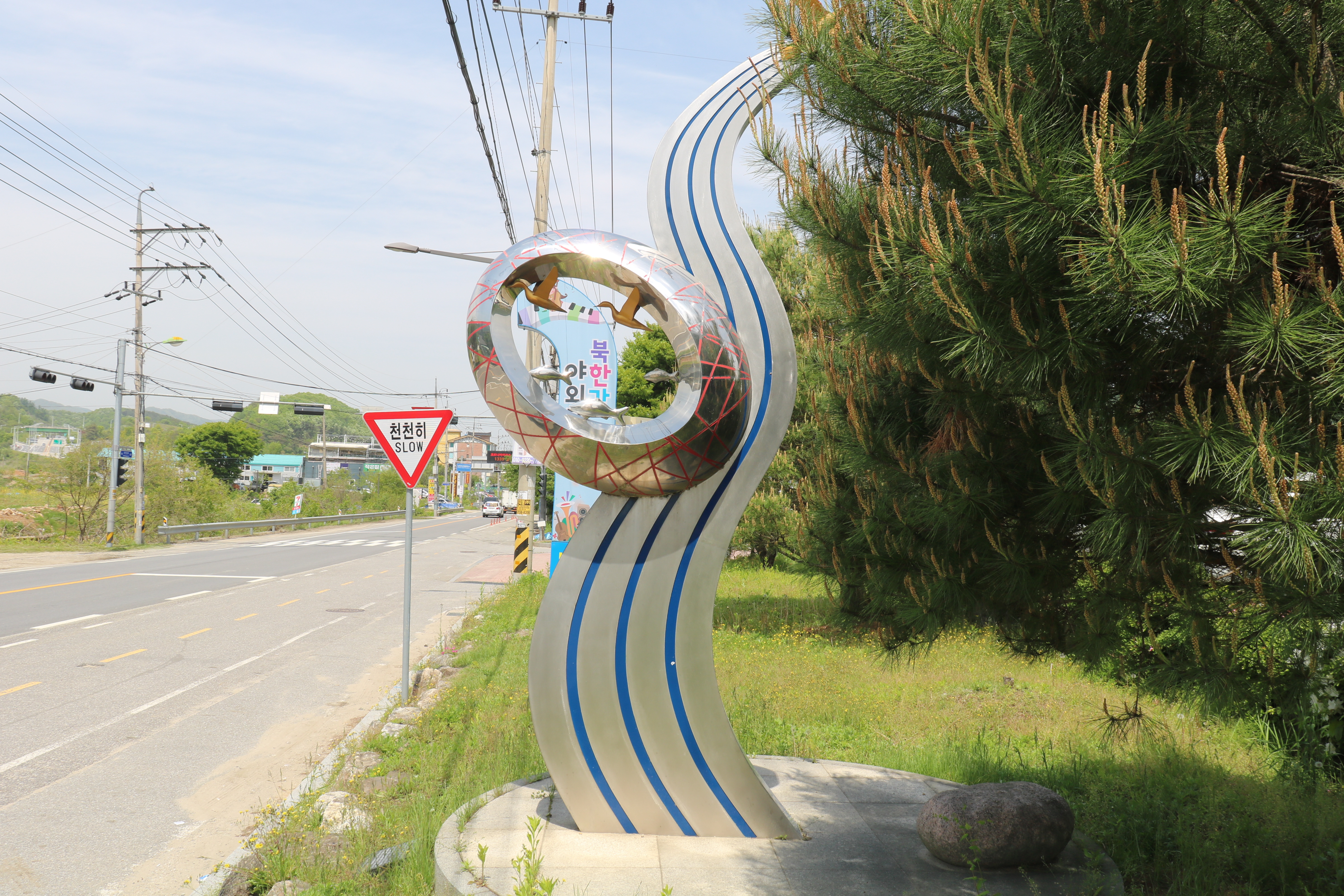 입구에 멋진 조형물이 있습니다. 작품 제목은 '생명을 품고 흐르는 북한강'입니다. 북한강과 그 속에서 둥지를 튼 생명의 땅을 상징적으로 표현하였습니다. 때 묻지 않은 청정자연 북한강과 그 속에서 사람과 자연, 문화예술이 하나가 되는 공간을 보여주려 한 것이라고 합니다.
