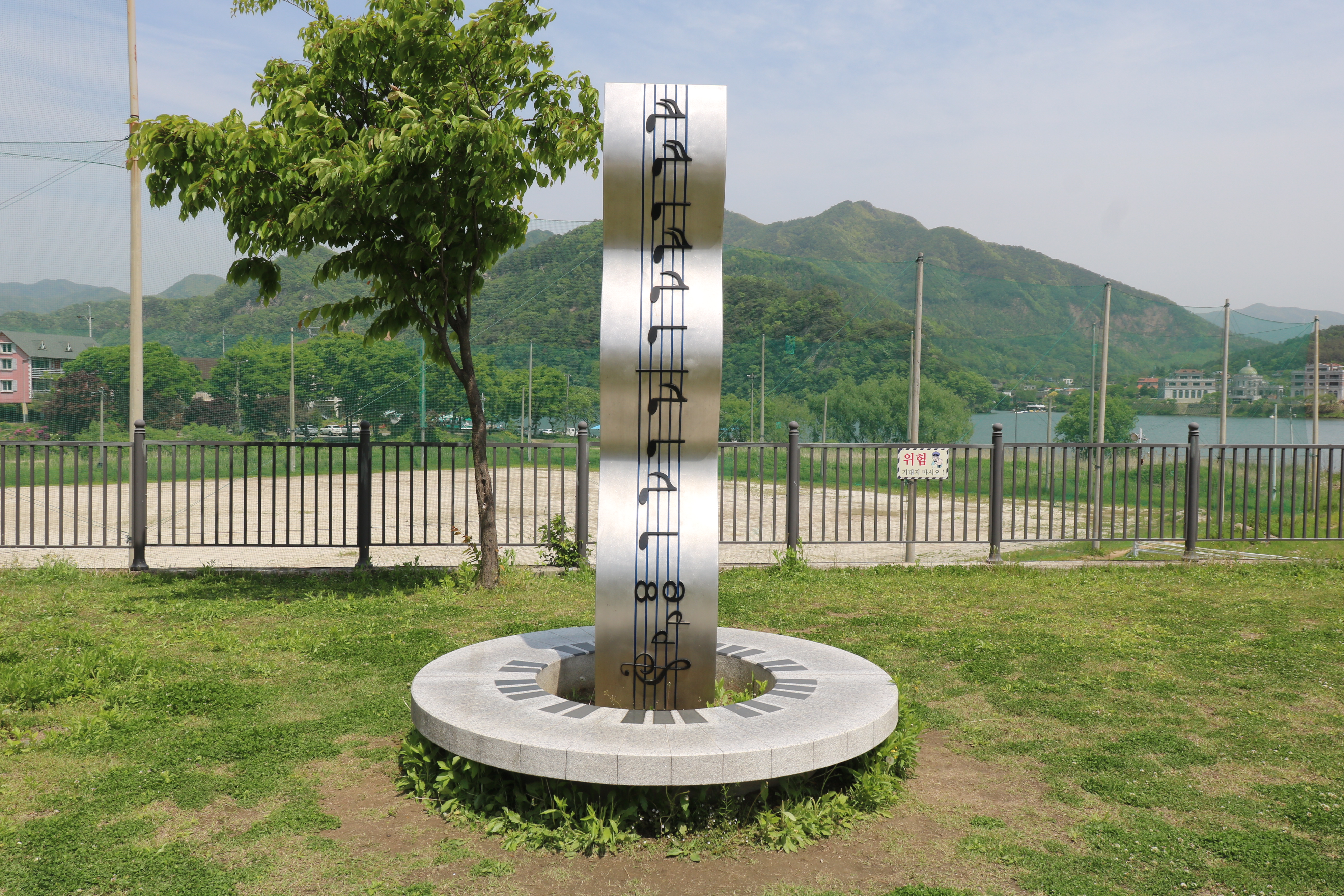 문학비 옆에 악보가 보입니다. 작품 아래 설명판이 있습니다. 제목은 '음악이 흐르는 풍경'입니다. 작품의 기본 형태는 피아노와 오선지를 조형적으로 표현했습니다. 피아노의 형태를 원형으로 조형화시켜 휴식의 기능과 함께 음악을 느끼는 공간으로 구상하였습니다.