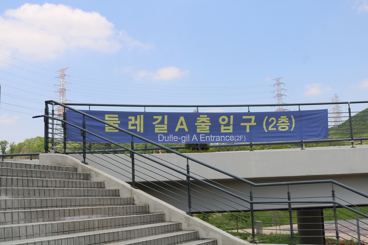 1층을 둘러보고 나니 2층 둘레길 A 출입구 현수막이 보였습니다. 용인미르스타디움에 둘레길이라니? 이곳을 통해 산으로 가는 걸까? 궁금해서 올라가 봤습니다.