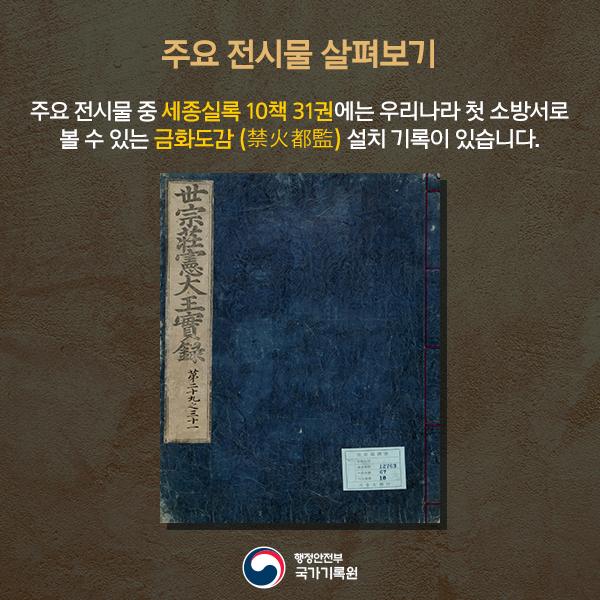 실록에 나온 피해 규모를 볼까요? 수도 한성(漢城)에서 화적의 방화로 1,100채가 넘는 민가가 불에 타고 어린아이와 노인 등 최소 32명이 숨지는 큰 참사가 벌어졌습니다. 세종은 지금의 서울시청 격인 한성부(漢城府)에 금화도감(禁火都監) 설치를 명합니다. 우리나라 최초의 소방관청인 금화도감은 세종 8년(1426) 대화재 속에서 탄생했습니다.