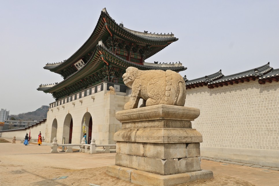 광화문 앞에 가면 서 있는 것이 해치입니다. 해치는 물의 신입니다. 이 물의 신상을 광화문 정면에 배치한 이유는 바로 관악산의 화기를 막기 위함이었습니다. 관악산 정상의 모습을 보면 불타는 듯한 모습을 볼 수 있습니다. 이런 화기가 궁궐에까지 이어져 화재로 이어진다는 생각이 있어, 이를 막고자 세운 것이 바로 해태입니다.