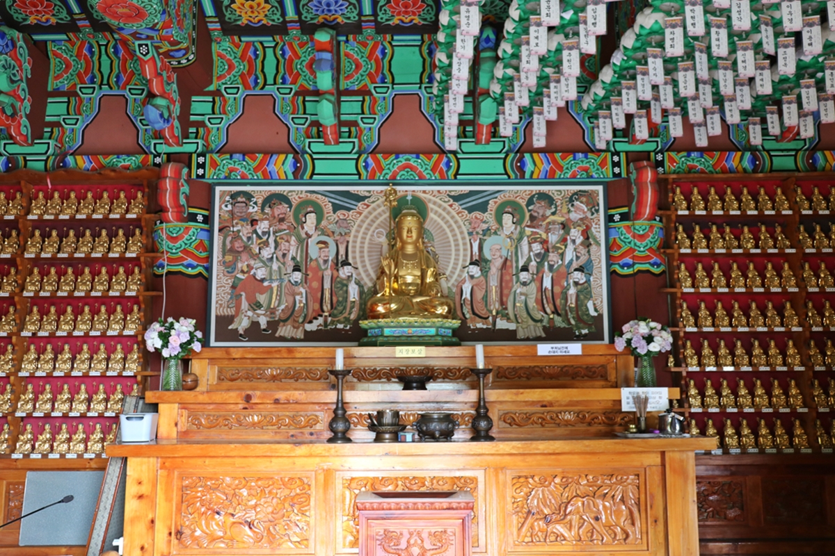 삼성각에 내려와 대웅보전 좌측에 있는 지장전을 봤습니다. 금동 지장보살과 그 뒤로 탱화가 있습니다. 지장전에도 좌·우측에 작은 불상들이 빼곡하게 있습니다. 그리고 천정에는 불자의 기원을 담은 연등이 걸려 있습니다.