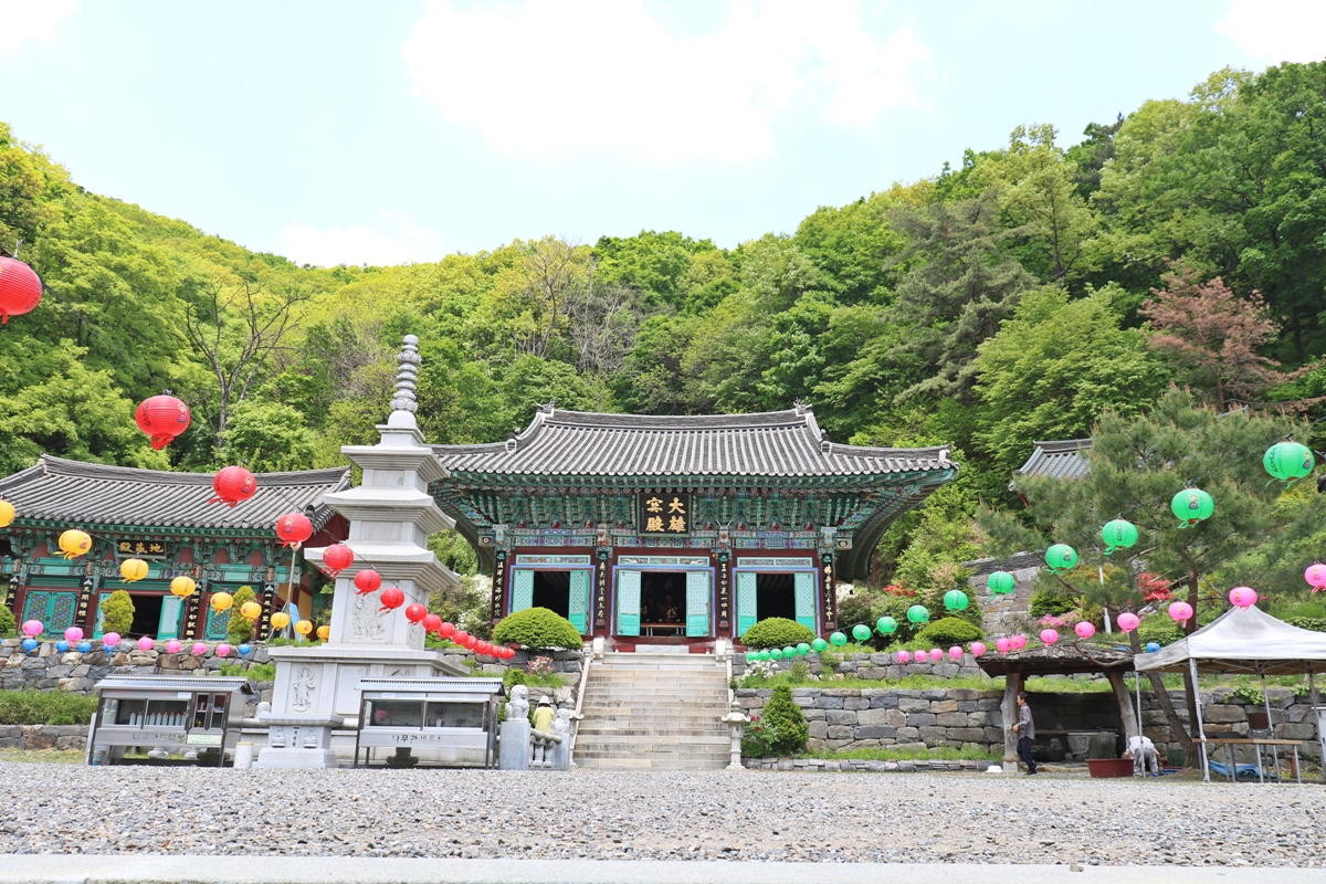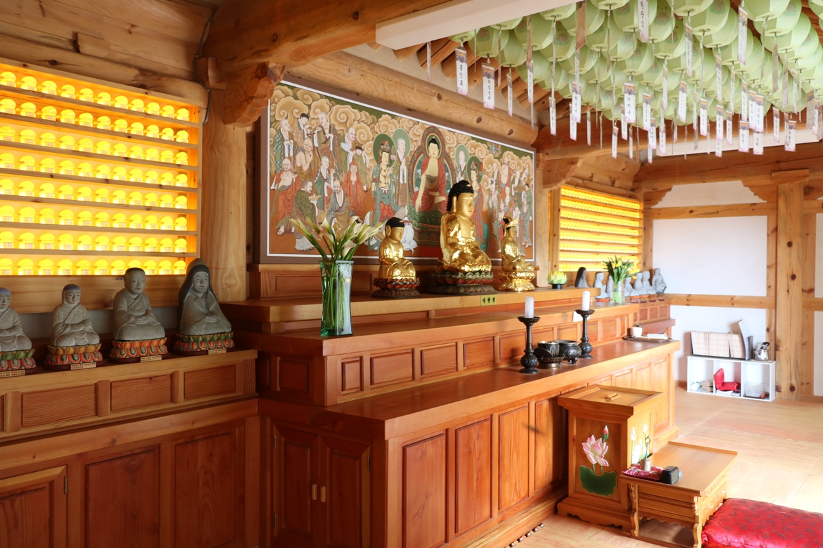 대웅보전 안을 보니 비로자나불, 석가모니, 노사나 등 부처님 세 분이 모셔져 있습니다. 중앙 불상 좌·우측에는 작은 불상 수백 개가 모셔져 있습니다.