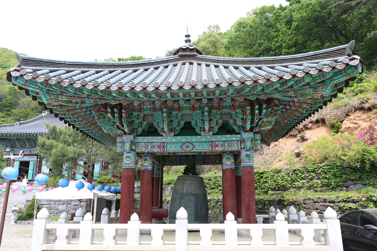 사찰 경내로 들어서면 가장 먼저 범종각이 보입니다. 범종각은 불교 사찰 내에 범종을 달아둔 전각입니다. 일반적으로 단층일 때는 각(閣)이라 하고 중층일 경우 루(樓)라고 하는데요, 백련사는 단층이기 때문에 범종각이라 합니다.