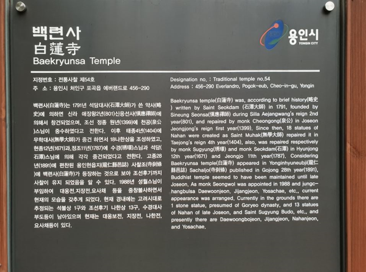 백련사는 신라 애장왕(801년) 때 신응선사가 세운 절입니다. 그러니까 1200년이 넘은 사찰입니다. 지금까지 여러 차례 중수를 거쳤다고 합니다. 천년 고찰이며, 용인에서 가장 오래된 사찰입니다.