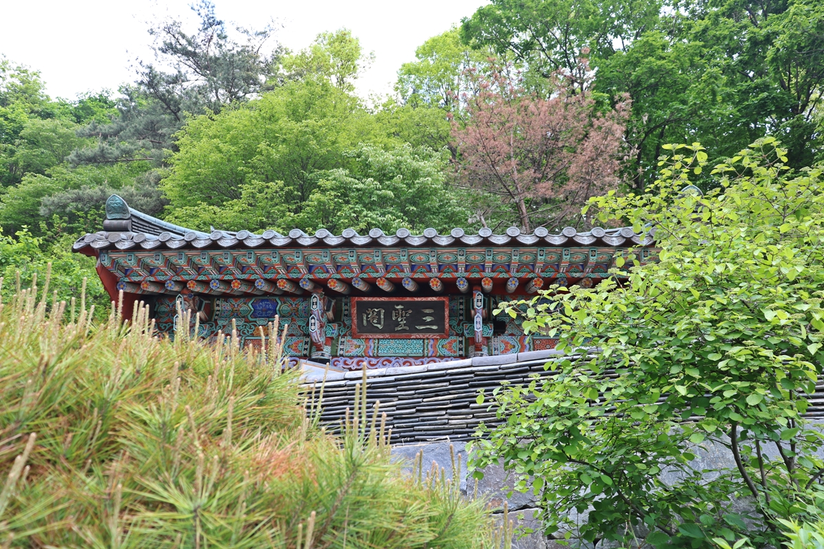 백련사에서 가장 높은 곳에 삼성각이 있습니다. 삼성각은 보통 사찰 가장 뒤쪽 높은 곳에 자리하고 있습니다. 문이 열려 있어 안을 보니 가운데 칠월성궁, 좌측에 산왕대신, 우측에 나반존자 탱화가 있습니다. 탱화 아래 어떤 분인지 쓰여 있습니다.