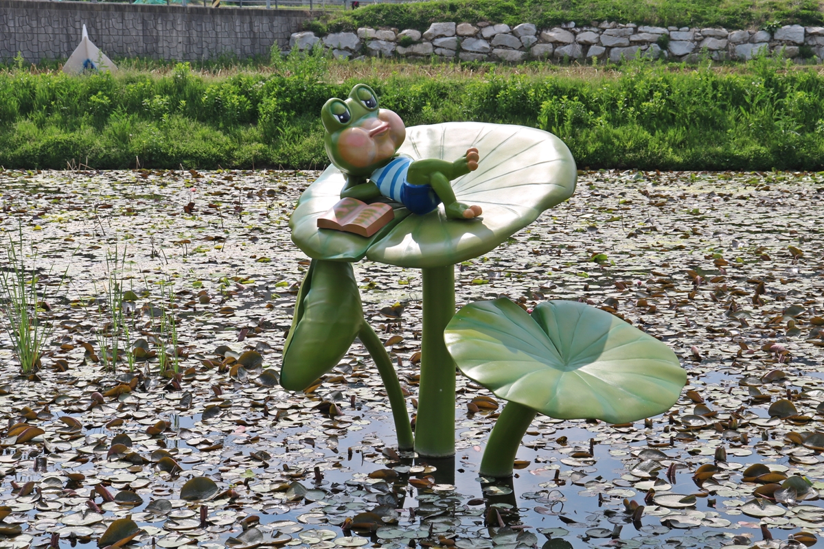 날은 좀 뜨겁지만 연꽃단지 산책로는 거닐 만합니다. 그리 넓지 않기 때문이죠. 지금은 연꽃이 만개하지 않았지만, 다른 꽃들이 피어 있네요. 연꽃이 피면 만개한 연꽃을 보느라 더위 따위는 잊을만한 곳입니다. 연꽃밭에 종이배 모형이 있어서 이곳에서 SNS에 올릴 사진을 찍으면 좋겠네요.