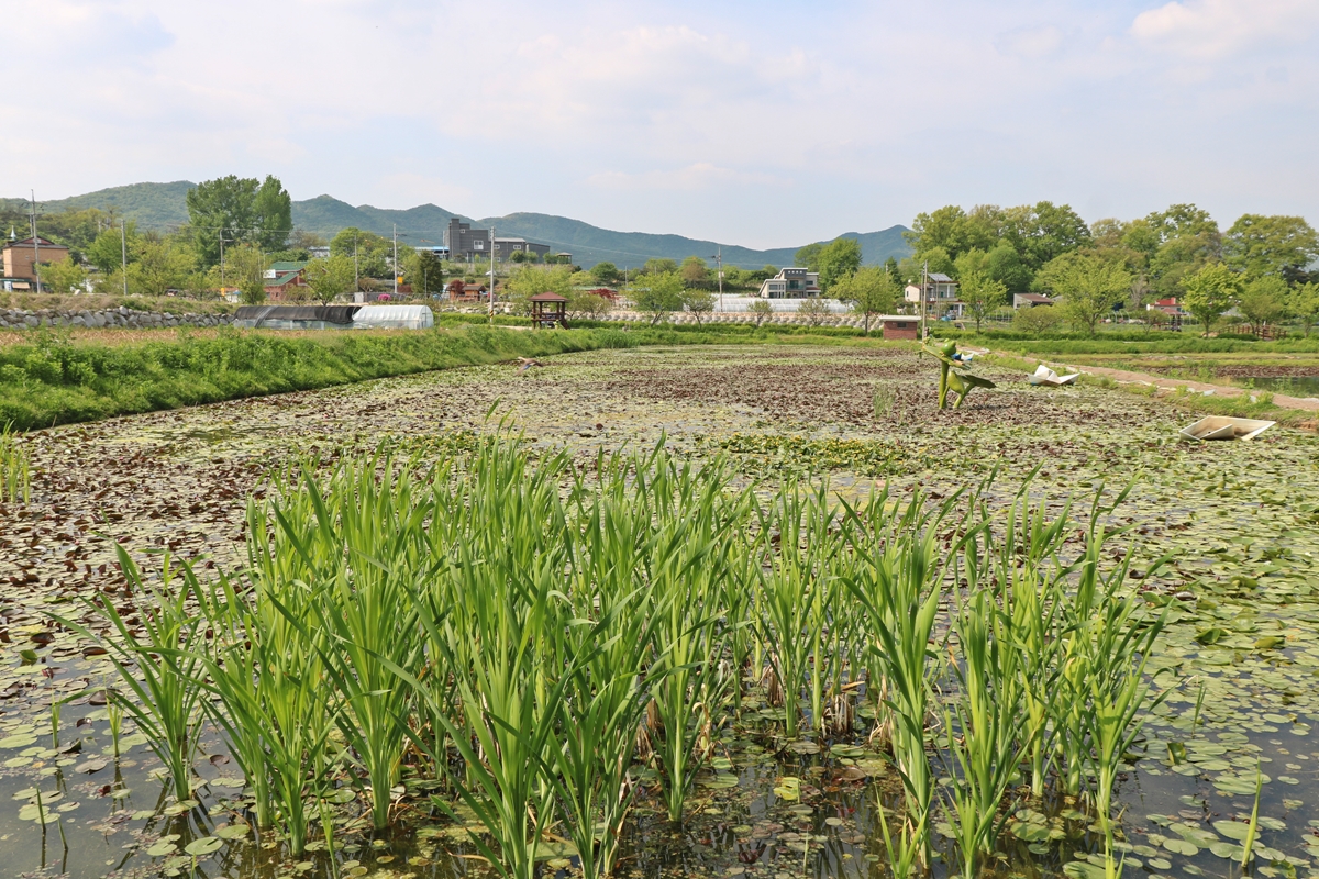 내동마을 연꽃단지는 총면적이 8.2ha에 달합니다. 가람백련 등 10여 종의 연과 수련 15종 등 다양한 수생식물과 초화류 단지로 조성되어 있죠. 원래 조용한 시골 마을이었는데, 경관농업단지로 조성되었다고 합니다. 그래서 관광지처럼 안내판 등이 잘 설치돼 있네요.
