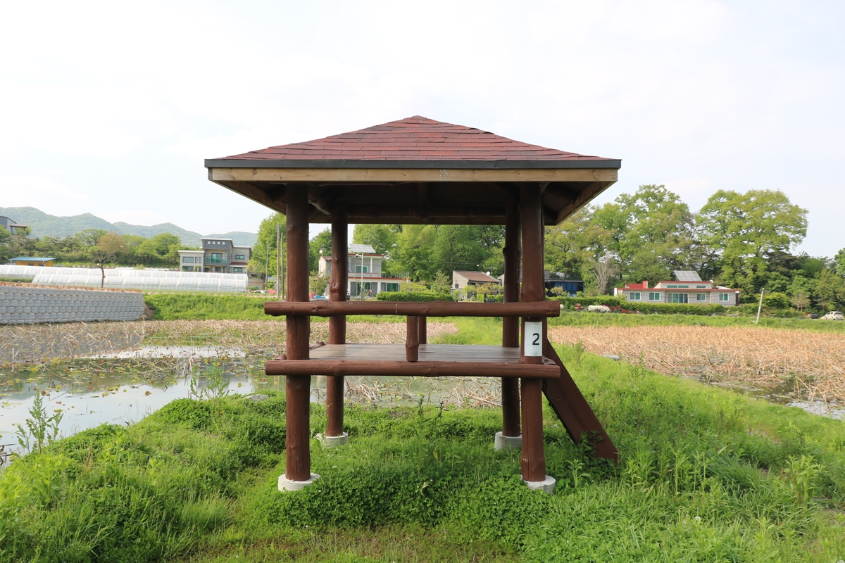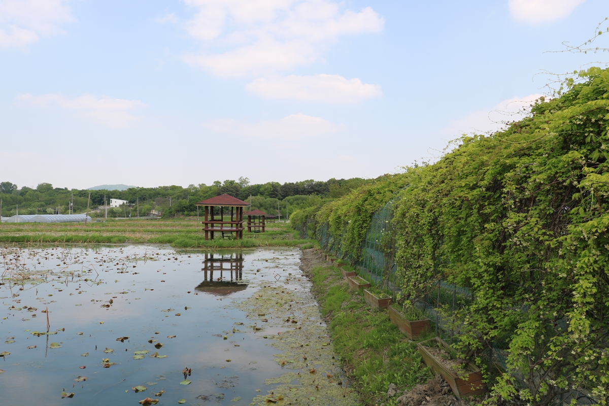 원두막에 많이 쉬었으니 이제 연꽃단지를 둘러봐야겠죠. 연꽃단지 중앙에 정자가 하나 있습니다. 여기도 원두막과 마찬가지로 먼저 차지하면 임자죠. 정자에서 보는 풍경도 일품입니다. 벌써 초여름이라 날은 뜨겁지만, 정자는 바람이 불어 더위를 1도 느끼지 못할 만큼 시원합니다.