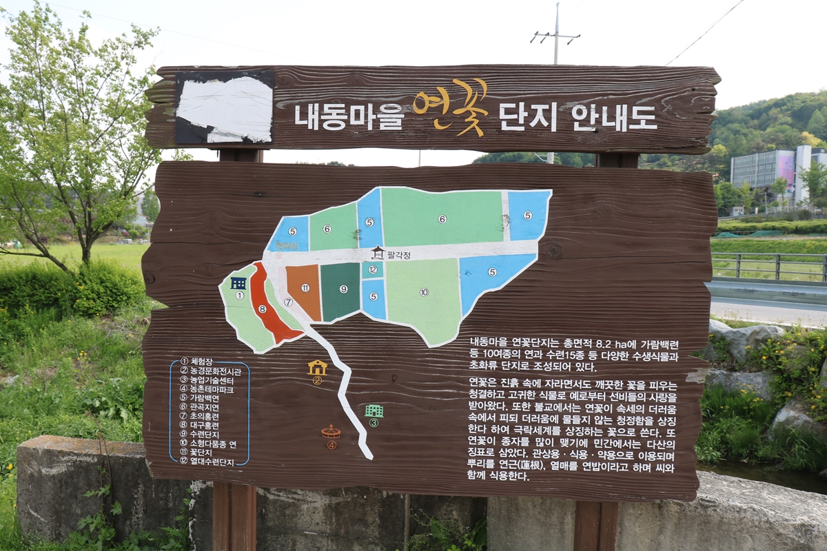 내동마을에 도착하면 내동마을이라고 크게 써놓은 입간판과 안내도가 있습니다. 이곳은 다양한 연꽃단지로 구성됐는데요, 연꽃이 피지 않아도 사부작사부작 산책하기 좋은 곳입니다.