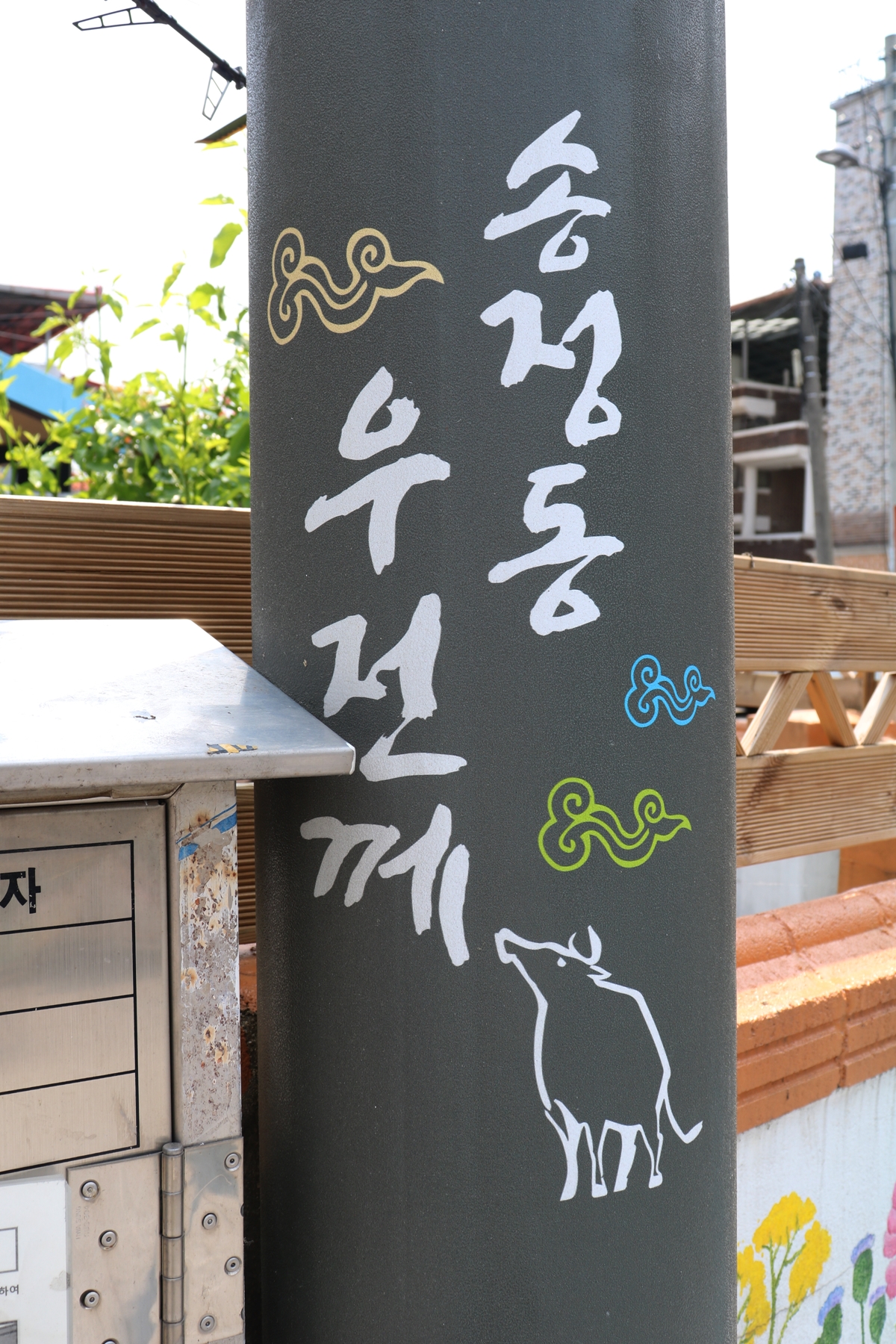 골목 전봇대에도 ‘송정 우전께’ 글과 함께 소 그림이 있습니다. 이 마을이 옛날에 우시장이었다는 것을 이곳을 찾는 사람들에게 알려주고 있습니다.