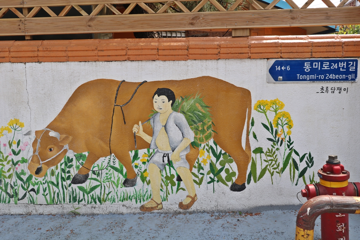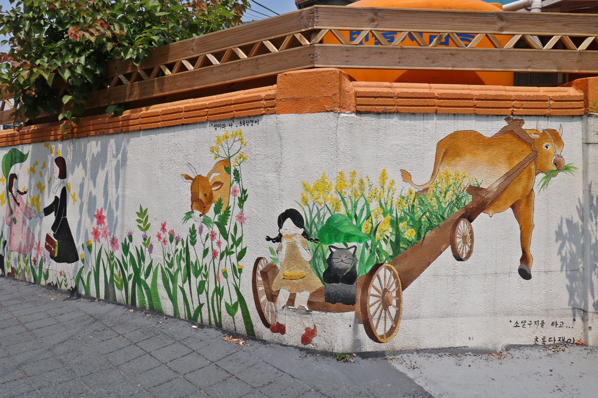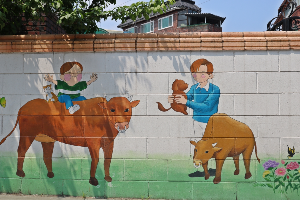 그래서 벽화도 대부분 황소 그림입니다. 소와 함께 놀고 소달구지도 타고요. 벽화를 그릴 때 마을 주민들이 소를 그려달라고 해서 소를 테마로 그린 거라고 하네요.