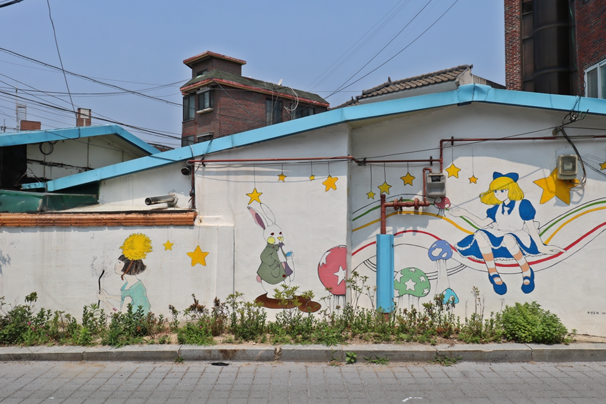 어릴 때 만화에서 봤던 그림들이 보입니다. 단독주택 도시가스 배관에 별이 주렁주렁 매달려 있고요. 주택에서 보기 흉한 것을 이용해 벽화를 그린 게 기발합니다.