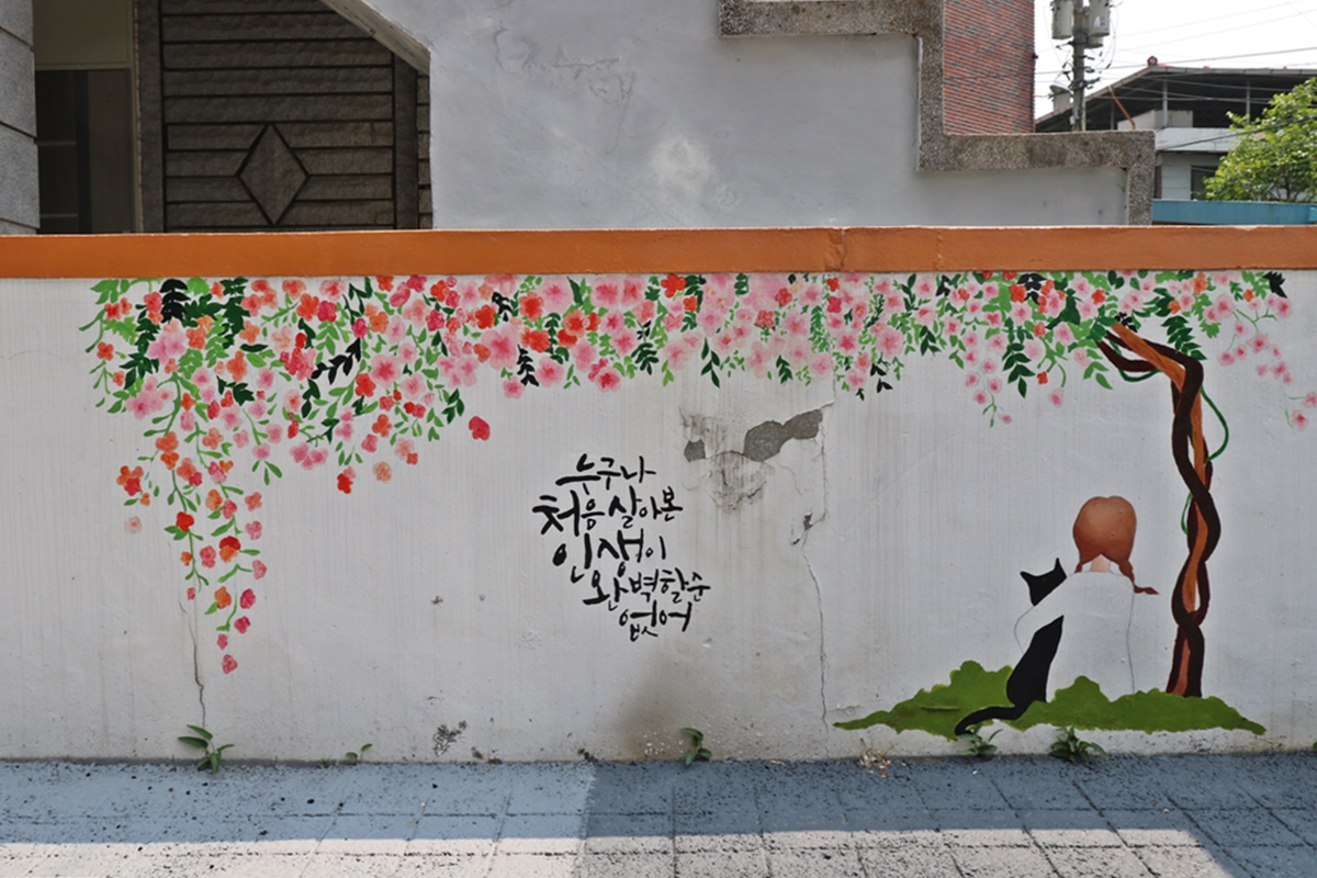 벽화 골목은 송정 3통 골목입니다. 단독주택 벽과 바닥에 그림이 그려져 있습니다. 꽃과 나비, 동물 등이 어우러져 벽화를 보면 동심의 세계로 돌아가는 듯합니다.