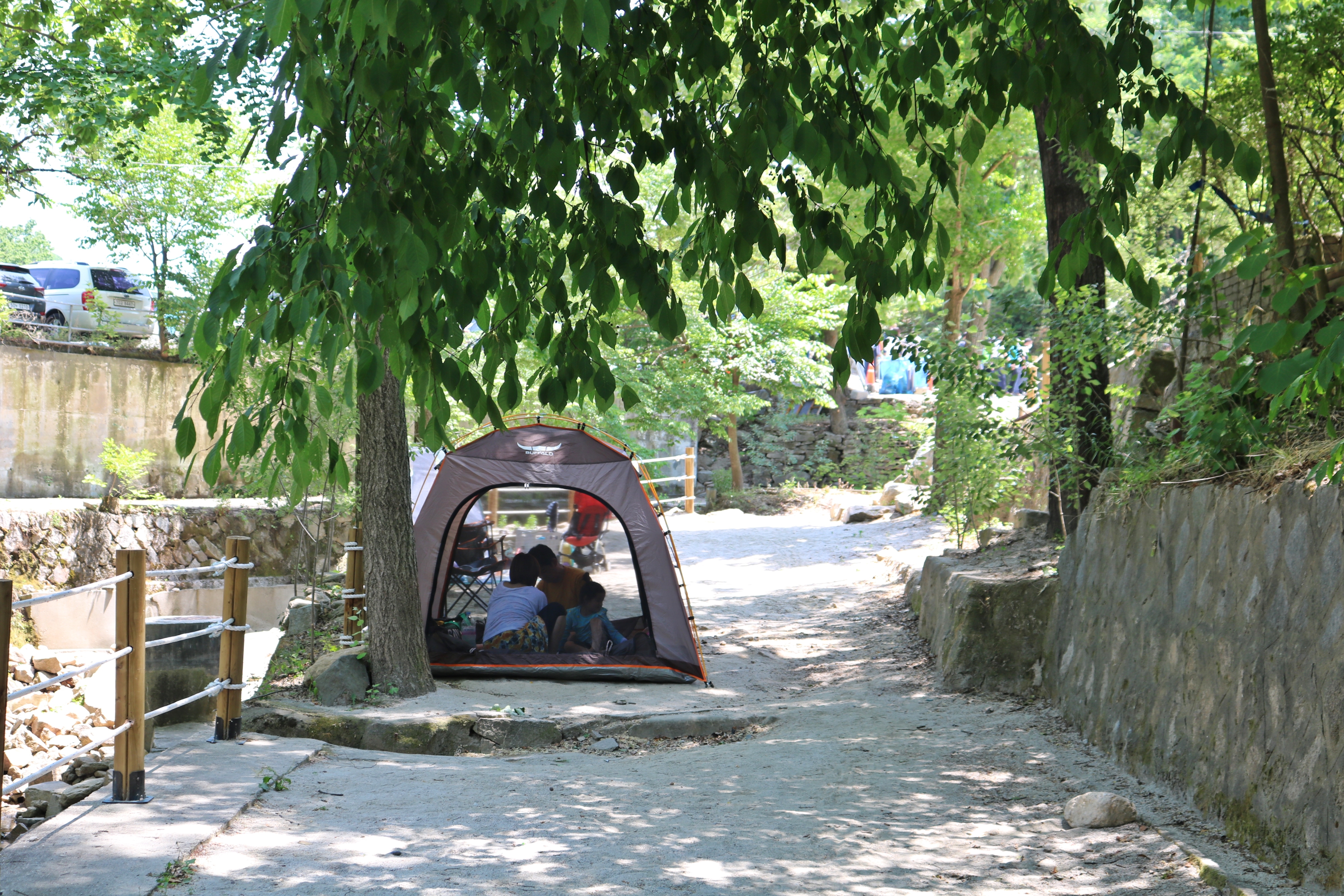 파라솔을 차지하지 못했다면 계곡 옆에 그늘막을 칠 수 있는 자리가 많습니다. 한여름에는 나무 그늘이 있는 물가도 좋지만요. 사실 계곡 근처 어느 자리에 가도 더위를 피하기 좋은 곳이라 여름에 인파가 많이 몰리죠.