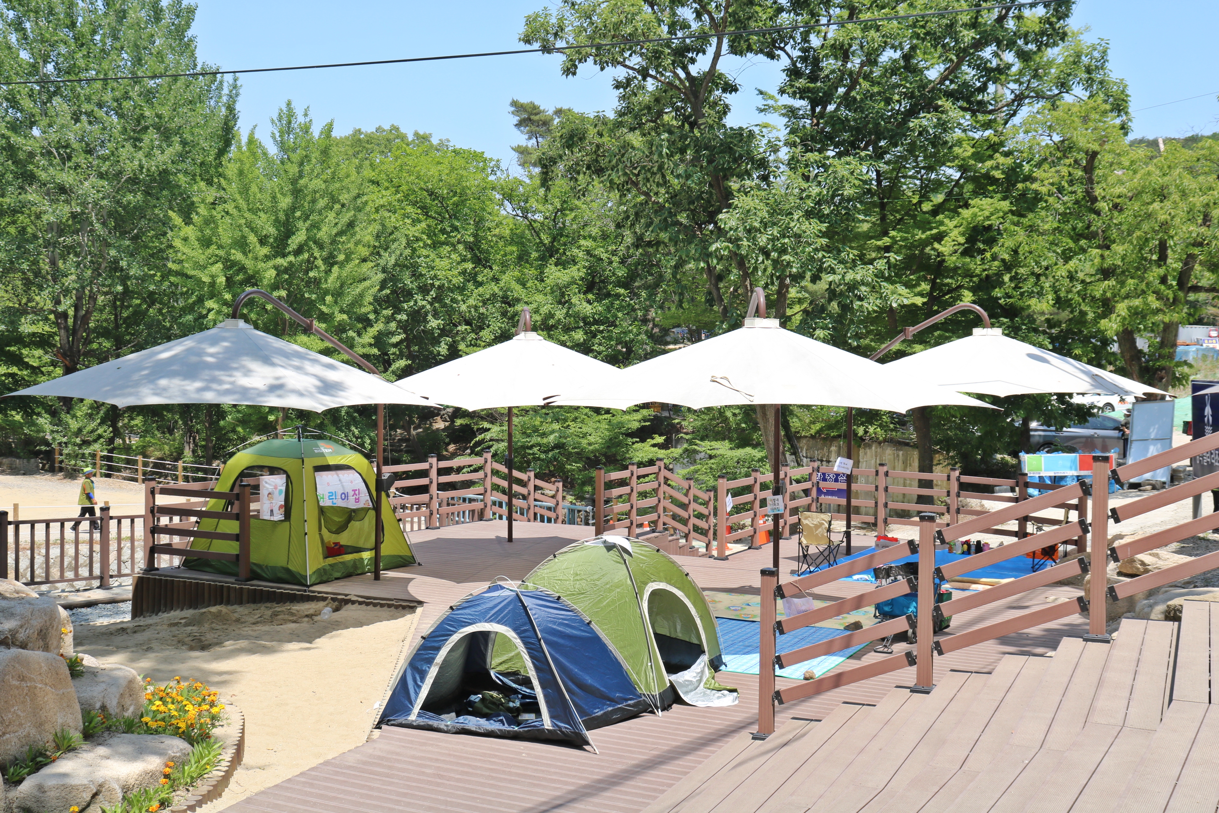 청학밸리에 큰 파라솔에 여러 개 세팅되어 있습니다. 파라솔 아래 자리는 치열한 자리다툼을 하는 곳이죠. 주말이면 아침 일찍 와야 자리를 차지할 수 있습니다. 부지런한 새가 먹이를 낚아채듯이 말이죠.