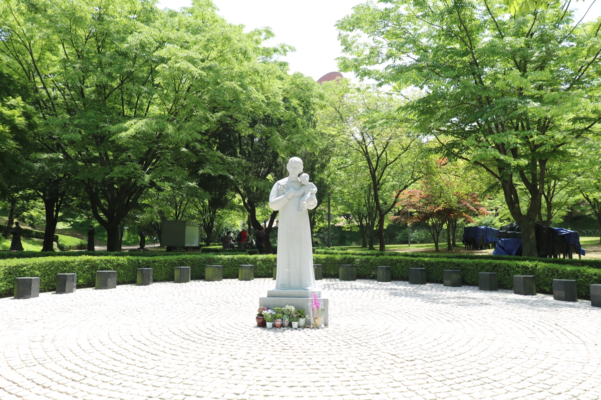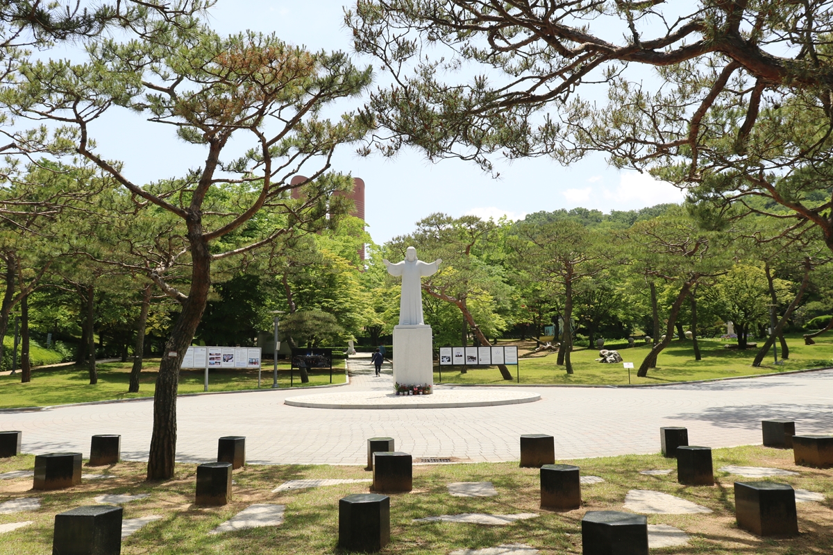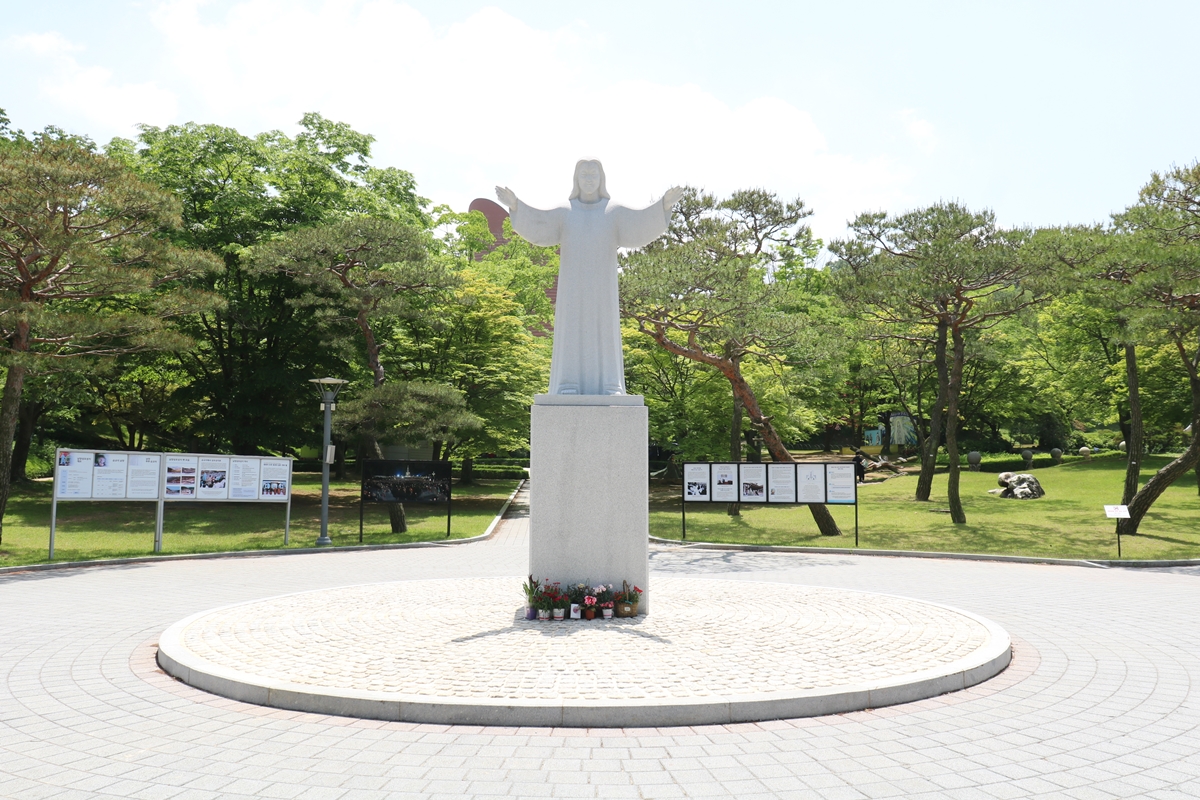 이곳이 남양성모성지 중앙입니다. 성모님이 두 팔을 벌려 ‘어서 와라~’ 하고 반겨주는 듯합니다. 이 동상을 보면 누구나 마음이 편안해질 것 같습니다. 일상에 지친 사람들에게 위로가 되는 성모님 동상입니다.