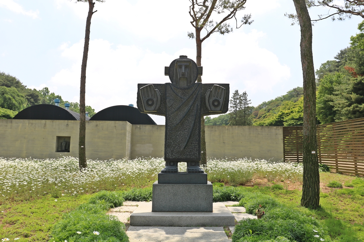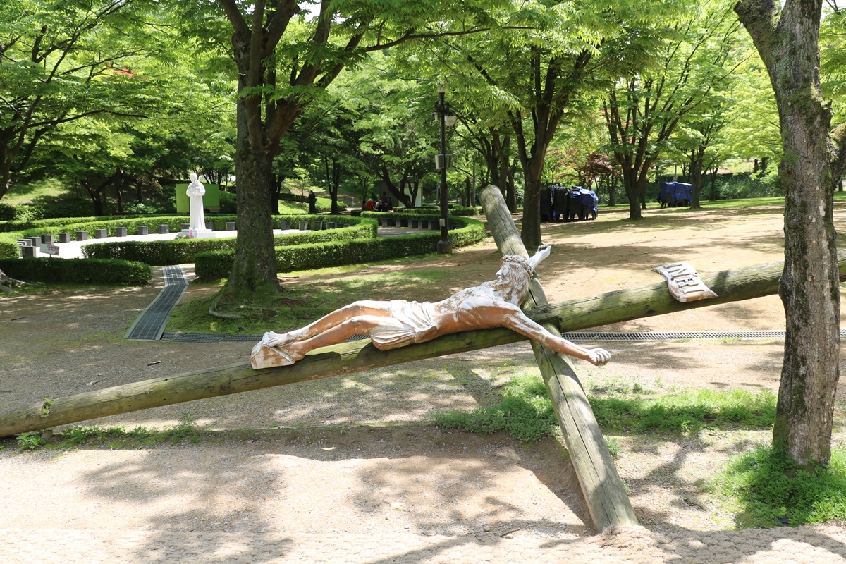 성모님 상 뒤로 누워 있는 십자가가 있습니다. ‘고난의 십자가’입니다. 보통 다른 성지 십자가는 세워져 있는데요, 여긴 왜 이렇게 만들어 놨을까요? 저는 그 이유는 잘 모르지만요, 하느님 모습을 더 자세히 볼 수 있어 좋았습니다. 세워져 있으면 높아서 잘 안 보이잖아요.
