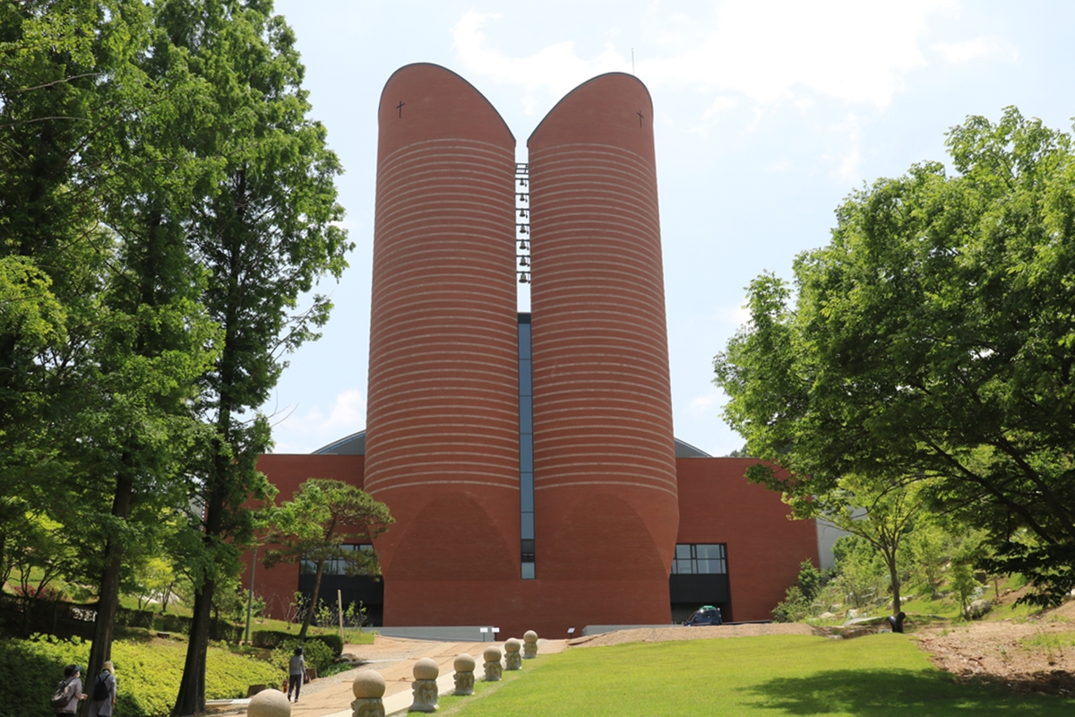 이제 대성당으로 올라가 보겠습니다. 멀리서 보니 두 개의 큰 기둥이 서 있는 듯합니다. 1,300석 규모의 대성당과 450석 규모의 소성당이 함께 있다고 합니다. 스위스 출신의 세계적인 건축가로 리움미술관, 강남 교보타워 건축가로 알려진 마리오 보타가 설계했다고 합니다. 그런데 미사 시간 외에는 문이 닫혀 있어서 들어갈 수 없습니다.