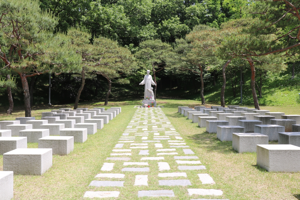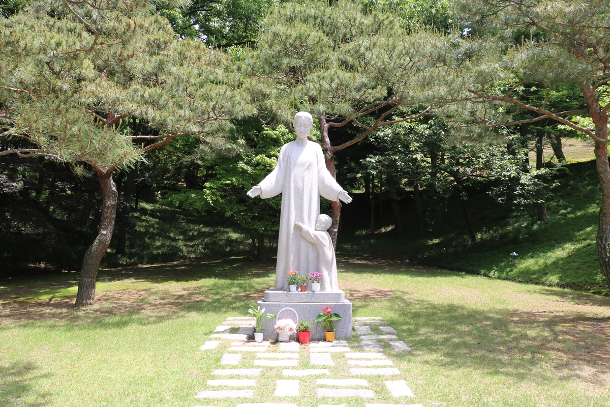 가까이 가보니 단아하고 정숙한 옛 어머니들의 머리 모양입니다. 인자한 미소로 반겨주시는 우리네 어머님을 보는 듯합니다. 이 동상은 1991년 누구나 ‘우리 엄마다’라고 느낄 만큼 한국적인 성모상을 만들기 위해 10년을 고민한 끝에 만들었다고 합니다.