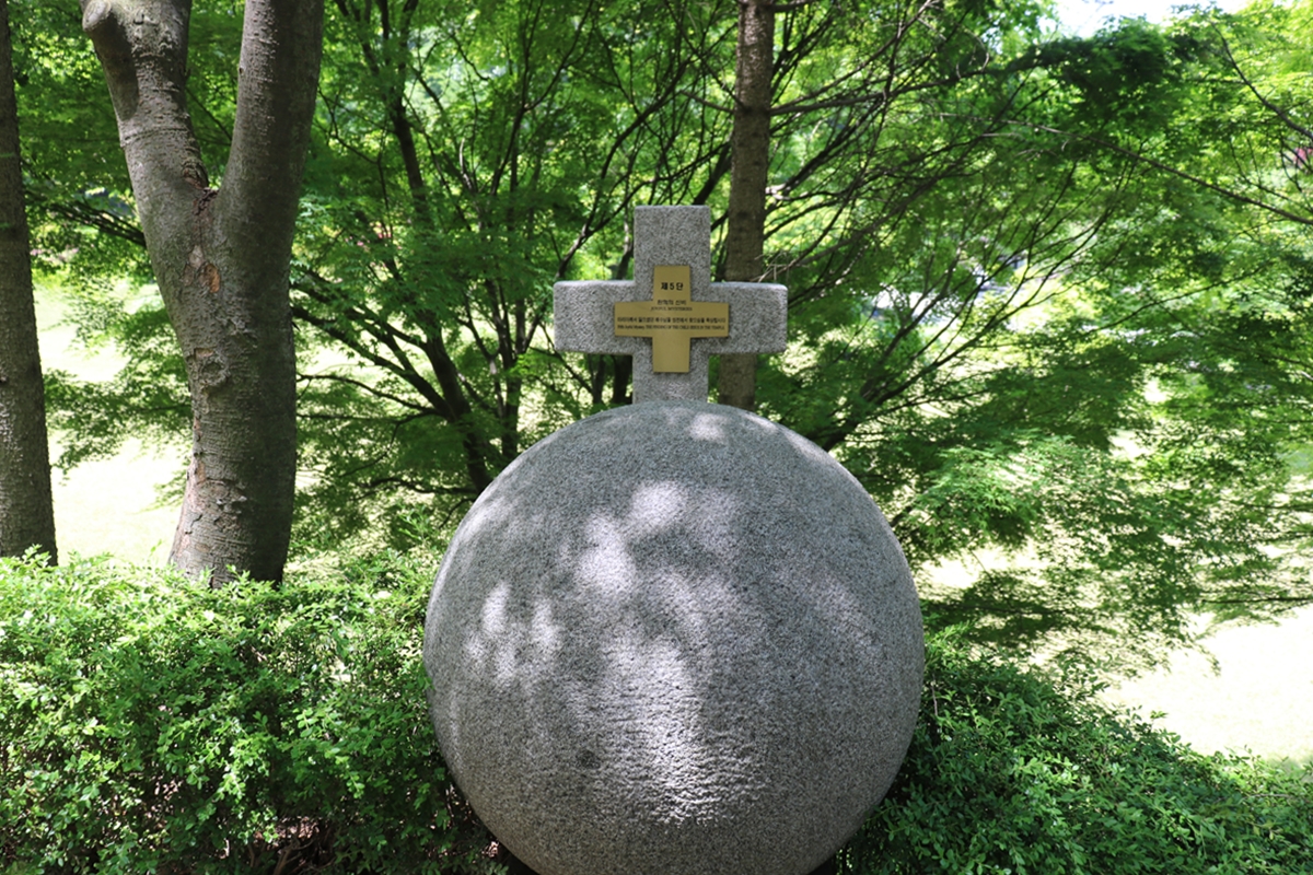 이곳이 순례자들이 찾아와 천주교 묵주기도를 시작하는 지점입니다. 뭔가 엄숙하고 경건해지는 곳입니다. 로사리오 성모 성지라는 이름에 걸맞게 성지에는 20단 묵주기도 길이 있습니다. 로사리오 광장 주변과 숲길을 따라 놓여있는 큰 돌 묵주 알을 한 알 한 알 짚어가며 20단의 신비를 묵상하게 됩니다.