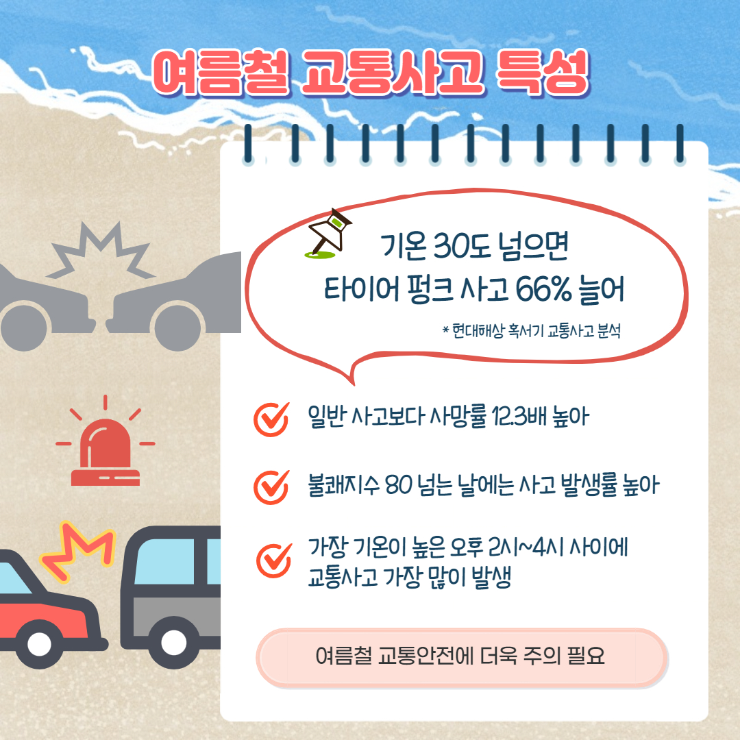 한 보험회사가 혹서기 교통사고 특성을 분석했는데요, 기온이 30도를 넘으면 타이어 펑크 사고가 66%나 증가한다고 합니다. 이에 따라 여름철은 일반사고보다 사망률이 무려 12.3배 높다고 합니다. 또한 불쾌지수가 80 넘는 날에는 사고 발생률이 높고요, 기온이 높은 오후 2시~4시 사이에 교통사고가 가장 많이 발생합니다. 따라서 여름철 교통안전에 더욱 주의해야겠죠.