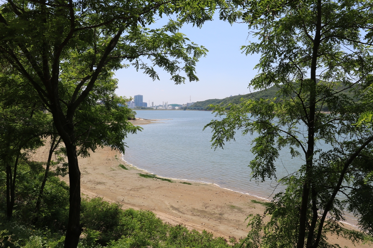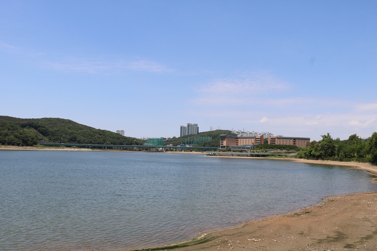 조금 걷다 보니 왼쪽으로 호수가 보입니다. 여느 때와 달리 가물어서 그런지 물이 많이 빠졌습니다. 이렇게 사진을 찍으니, 마치 해안가를 보는 듯하네요.
