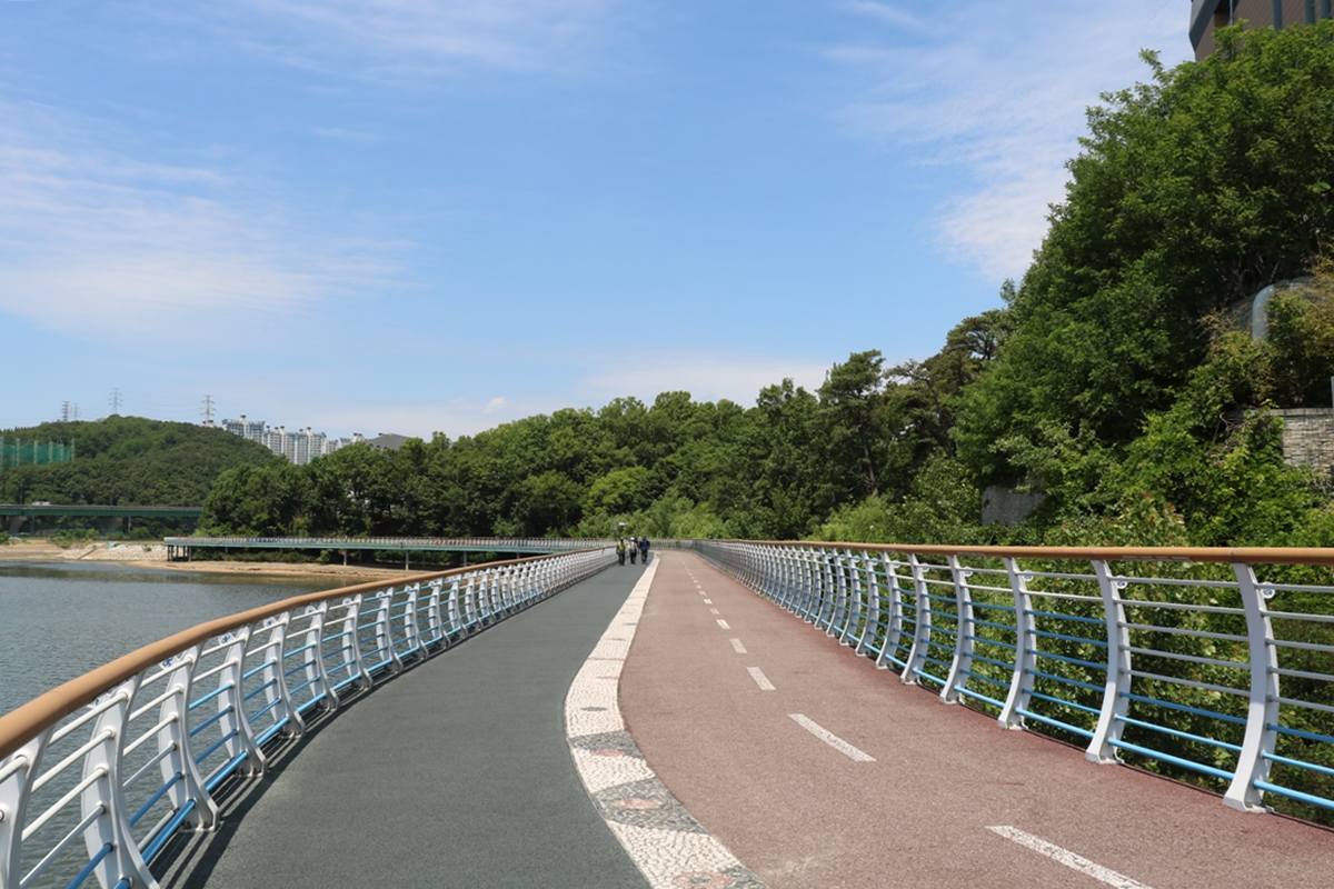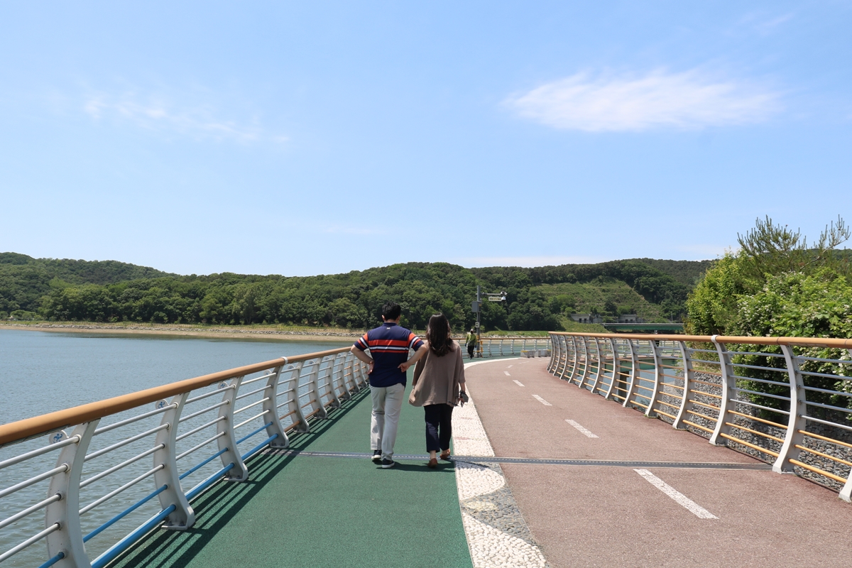 날은 좀 뜨겁지만, 연인, 부부, 친구들이 둘레길을 느긋하게 산책합니다.