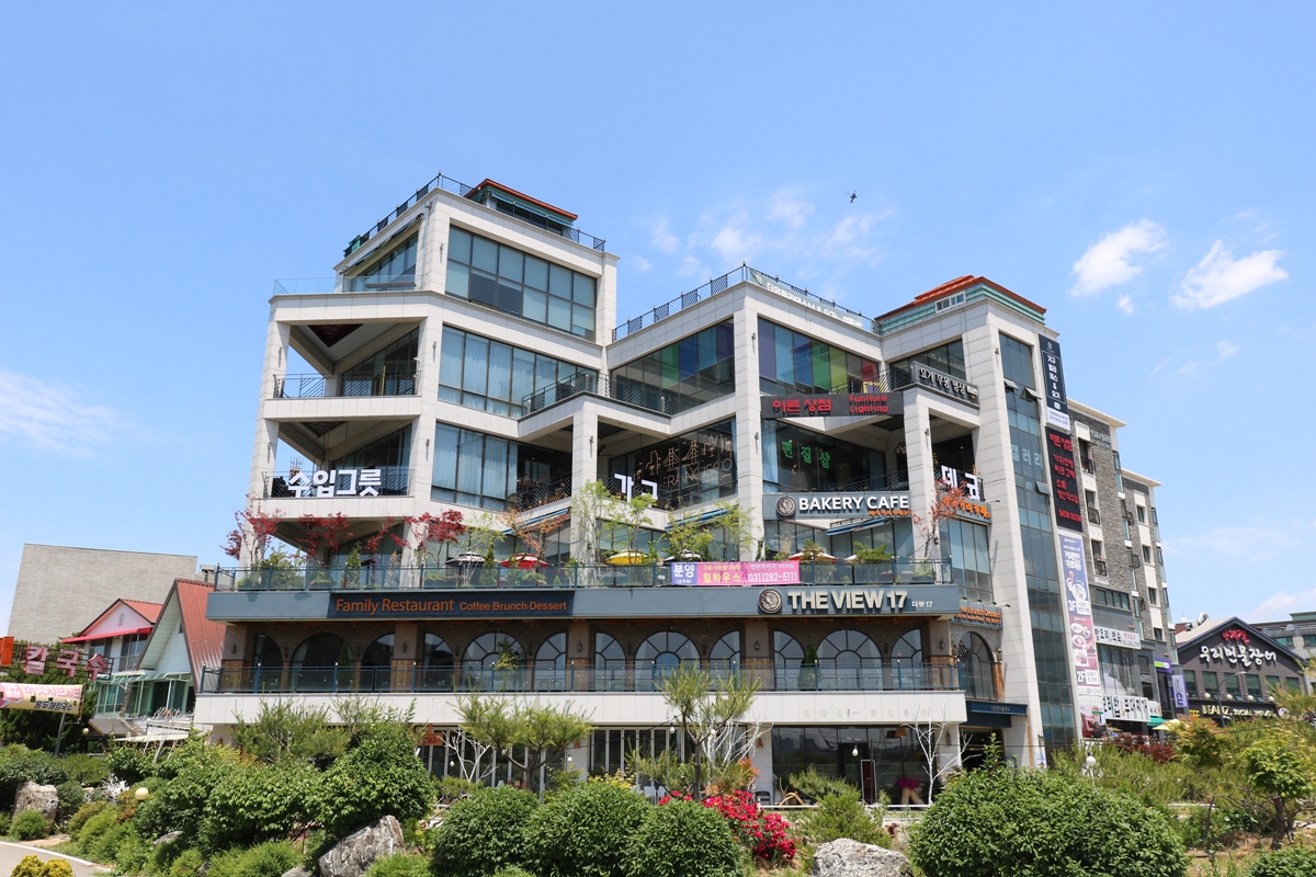 주차장 앞에 복합건물이 있습니다. 이곳이 카페와 음식점 등이 있는 곳이죠. 날씨가 좋아서 저는 카페에서 테이크 커피 한 잔을 사서 나왔습니다.