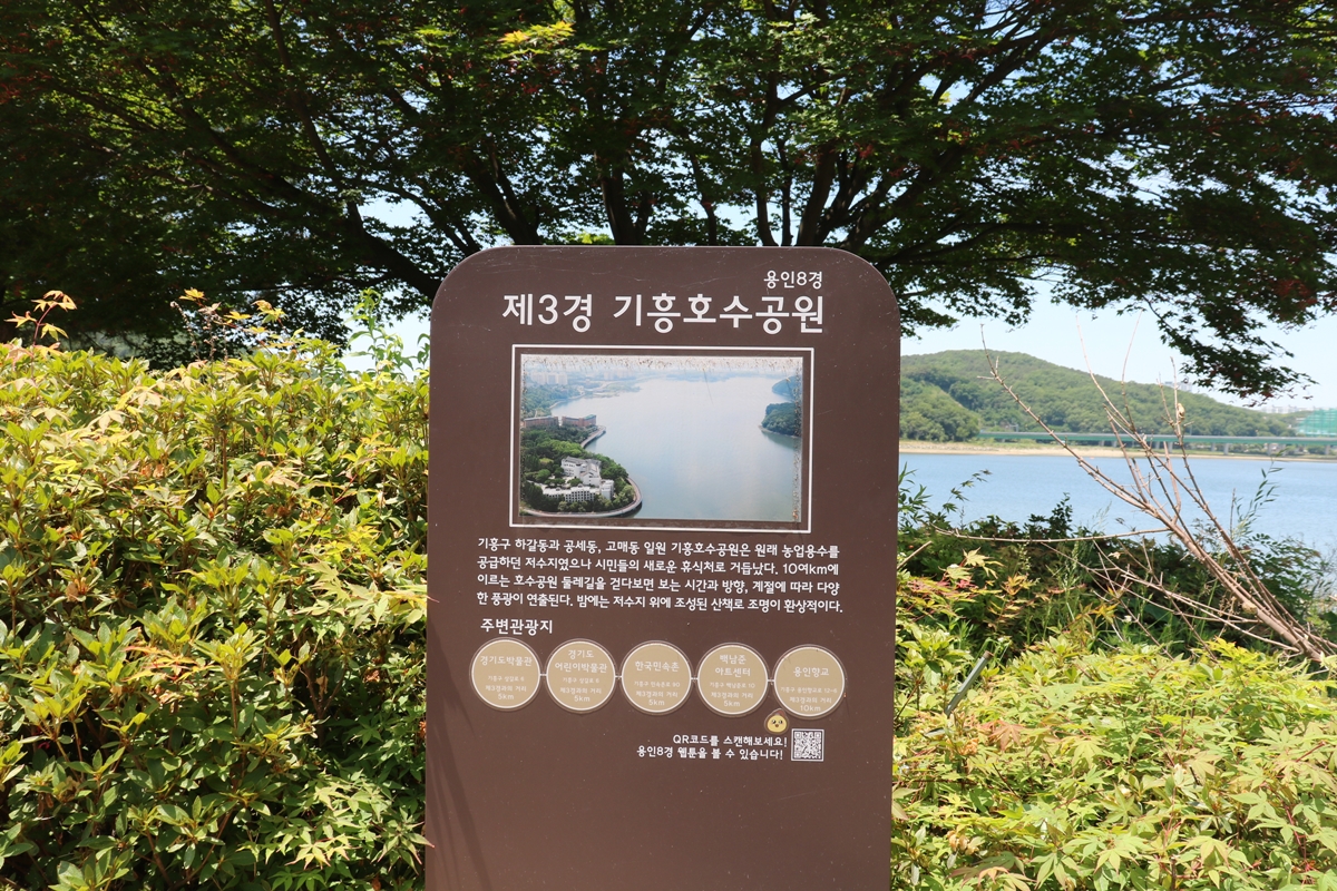 커피도 한 잔 마셨으니 이제 산책 좀 해볼까요? 입구에 용인 8경 중 제3경이 기흥호수공원이라는 안내판이 있네요. 기흥호수공원은 용인시 기흥구 하갈동과 공세동, 고매동 일월에 있고요, 원래 농업용수를 공급하던 저수지셨습니다.