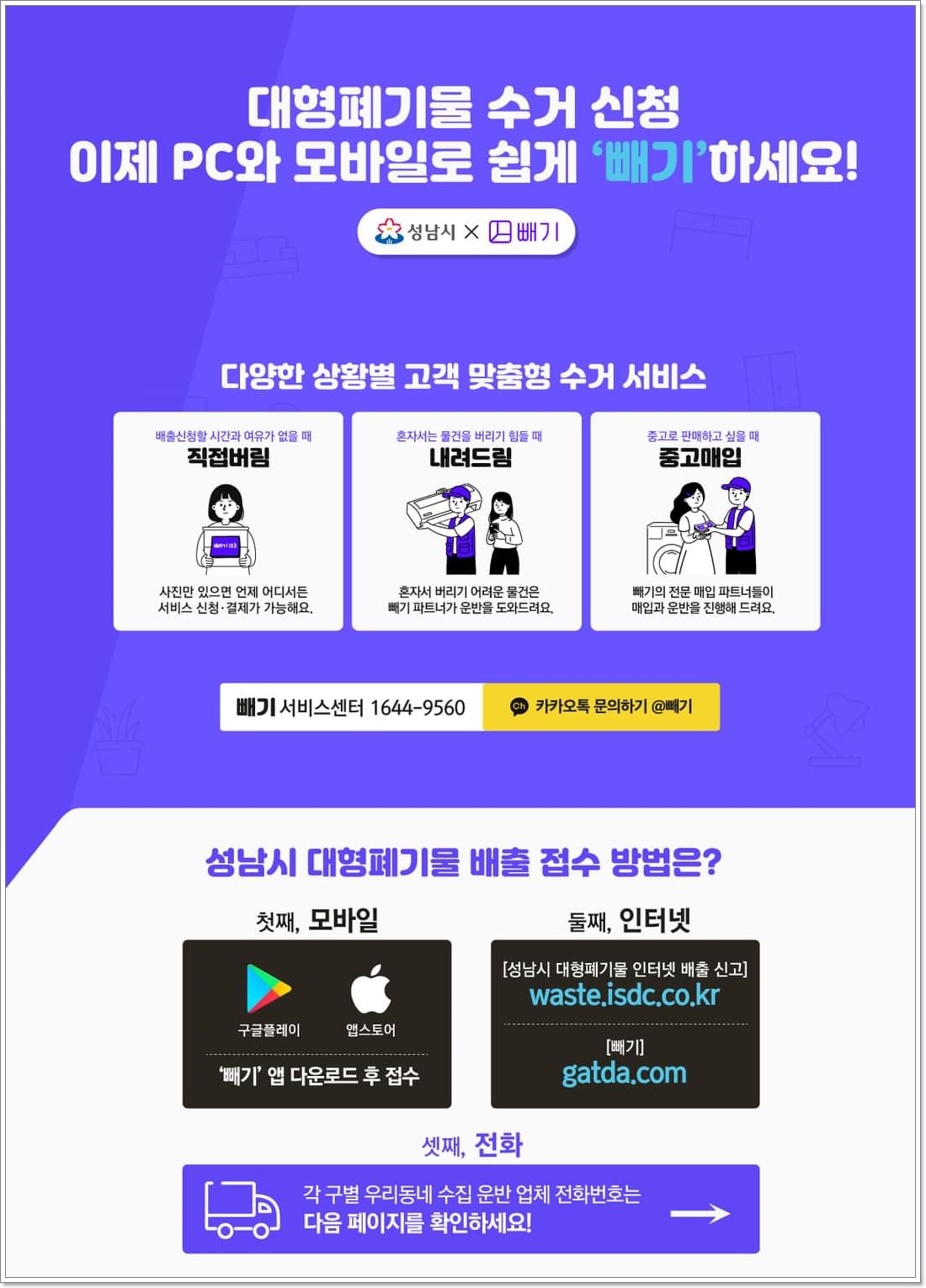 국내최대 환경자원 데이터 플랫폼 빼기입니다. 사진 한 장으로 대형폐기물 배출 신고 | 무겁고 버리기 힘든 대형물품 운반도움 | 중고판매를 빼기 앱에서 한번에 해결하세요.새롭게 버리는