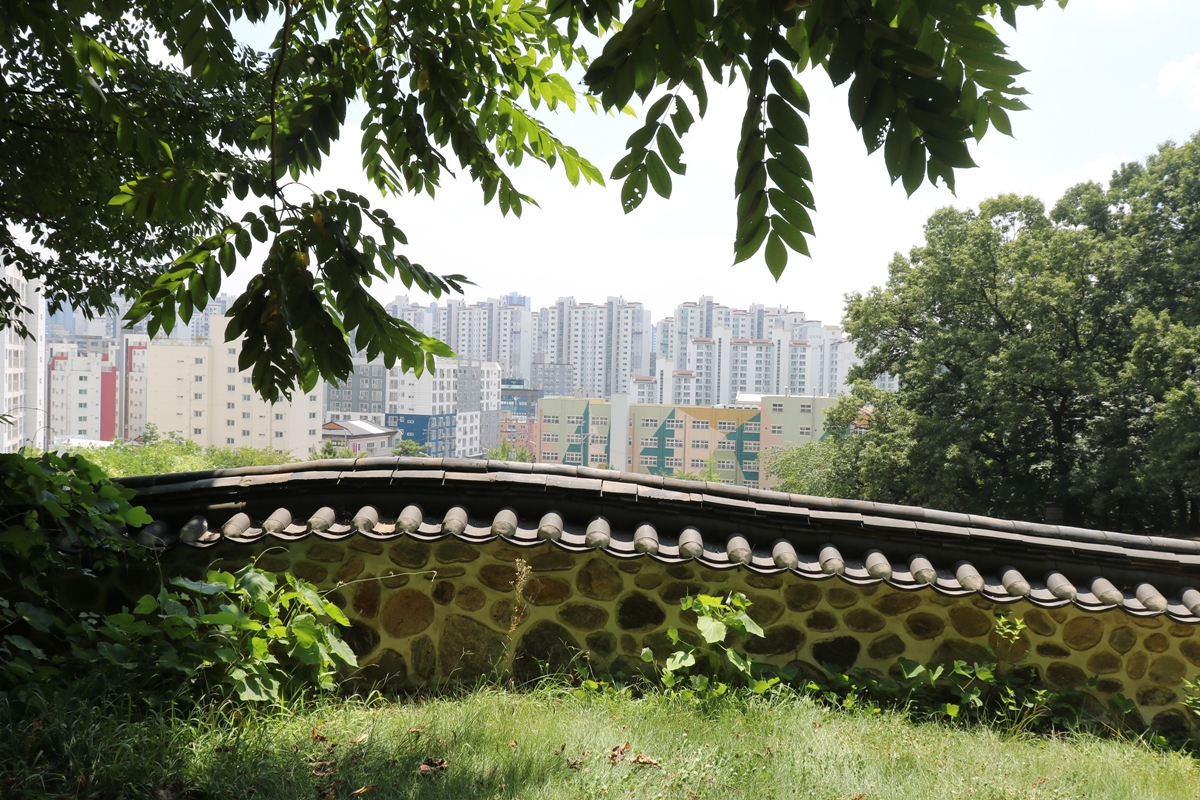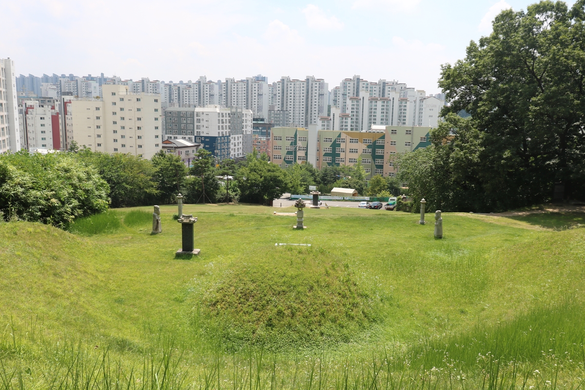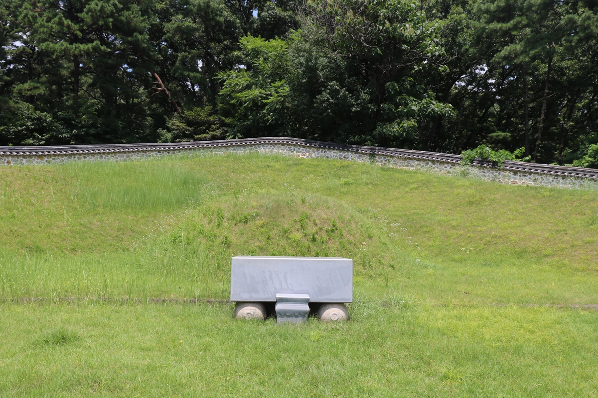 보통 왕릉에는 바깥쪽으로 3면의 곡장(曲墻; 나지막한 담)이 있는데요, 여기도 비슷한 게 있습니다. 일반 묘소 뒤로 돌을 언덕처럼 쌓은 것을 사성(莎城)이라고 하는데요. 높은 둔덕을 쌓고 그 뒤에 담을 쌓은 독특한 구조로 되어 있습니다. 담장 위로는 병풍처럼 포근히 감싸고 있는 듯한 나무들이 자라고 있습니다.