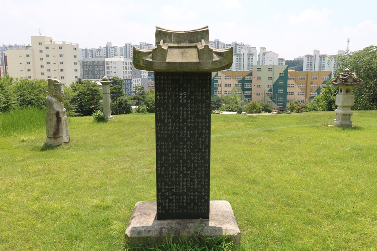 민영환 선생 묘소는 왕릉처럼 웅장합니다. 묘소에 올라가기 전에 신도비가 있습니다. 신도비에 민영환 선생이 대한제국 2천만 동포에게 보낸 유서를 새겨놓았습니다. 4면 가득 적혀진 그의 유서는 한자가 혼용되어 있습니다. 또 다른 면에는 한글로 적혀 있습니다.