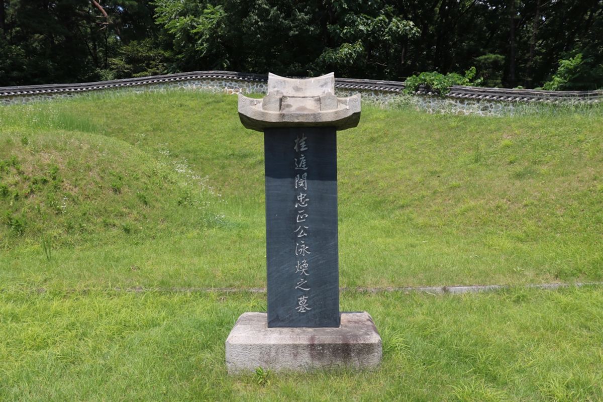 민영환 선생의 묘소 우측에 있는 묘비는 1959년에 건립된 묘비입니다. 앞면 글씨는 이승만 전 대통령이 썼으며, 옆과 뒷면에는 추모하는 분의 마음이 담겨 있습니다. 묘소는 햇볕이 잘 들고 시원하고 전망이 좋은 자리였습니다.