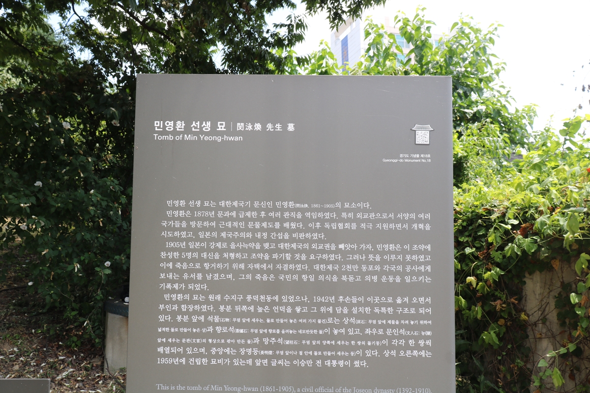 민영환 선생 묘 앞에 용인 독립운동유적 안내판이 있습니다. 그리고 경기도기념물 제18호 표지석도 있습니다. 유적지 안내문을 읽어보니 민영환 선생 묘가 처음에 있었던 장소는 수지구 풍덕천동 토월마을이라고 합니다. 1942년 후손들이 구성초등학교 뒤편 산기슭의 마북 근린공원 바로 아래에 모시면서 부인과 합창하게 되었습니다.