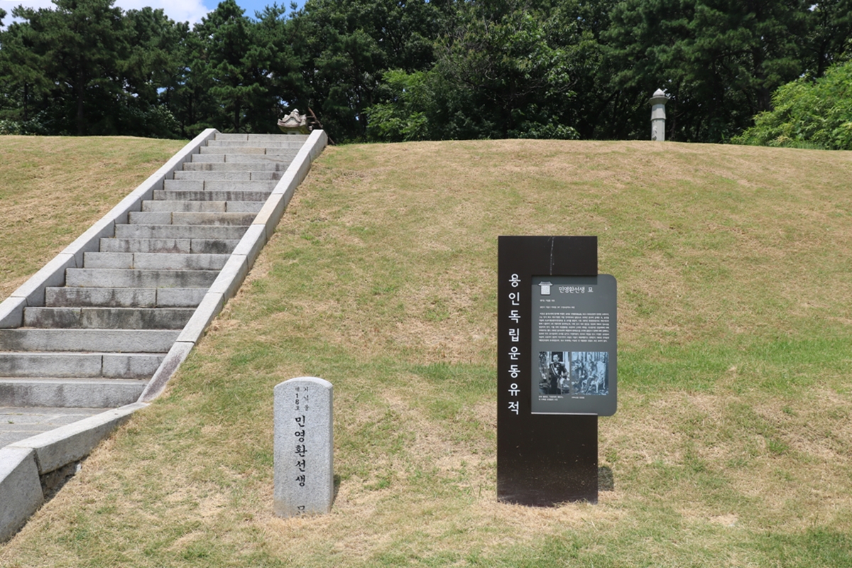 민영환 선생 묘소는 용인시 기흥구 마북동에 있습니다. 묘소 입구에 작은 주차장이 있습니다. 그리고 묘소 입구에 안내판이 있습니다. 안내판에는 민영환 선생 생애와 그가 을사늑약에 죽음으로 항거했다는 내용이 적혀 있습니다.