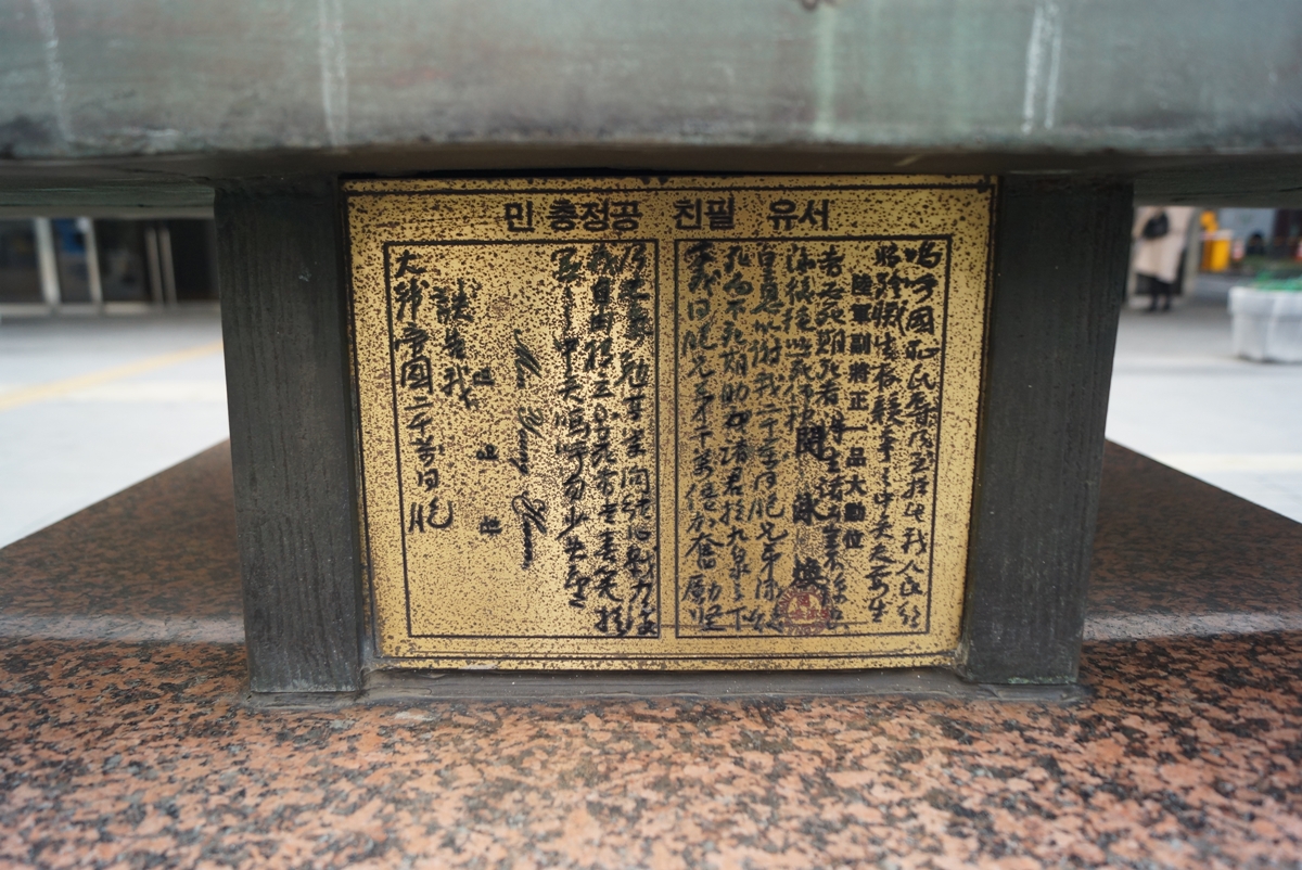 민영환 자결 터에는 한문으로 쓴 유서가 있는데요, 유서 내용을 보니 이순신의 ‘필사즉생 필생즉사’(必死則生 必生則死)과 비슷한 느낌을 받았습니다. 민영환의 유언을 읽으니 가슴이 먹먹했습니다. 민영환 자결 터를 본 후 그의 무덤이 경기도 용인시에 있다는 것을 알았습니다.