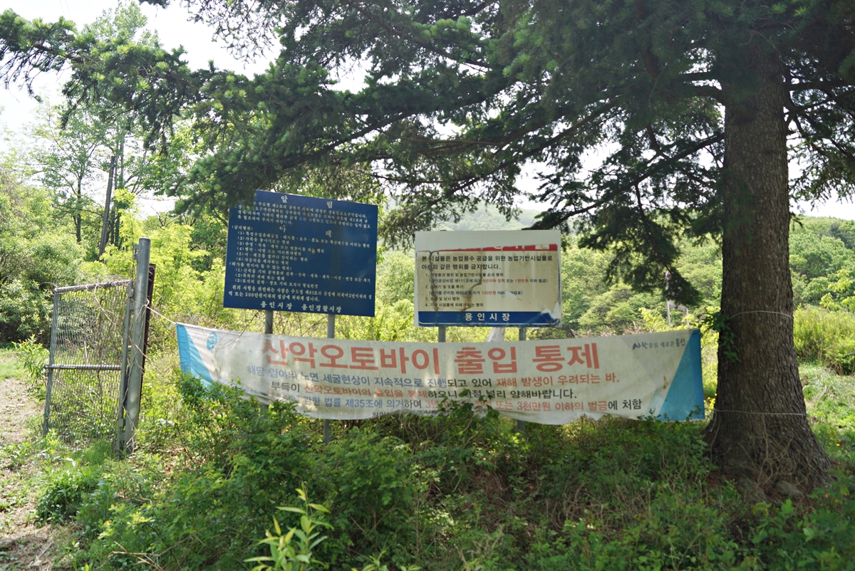 동산저수지는 농업용수 공급을 위한 시설입니다. 저수지로 들어가는 입구에 경고문이 있습니다. 이곳에 산악오토바이를 타러 많이 오나 봅니다. 만약 산악오토바이를 타다가 걸리면 3년 이하의 징역 또는 3천만 원 이하의 벌금에 처한다니 절대 타지 말아야겠습니다.