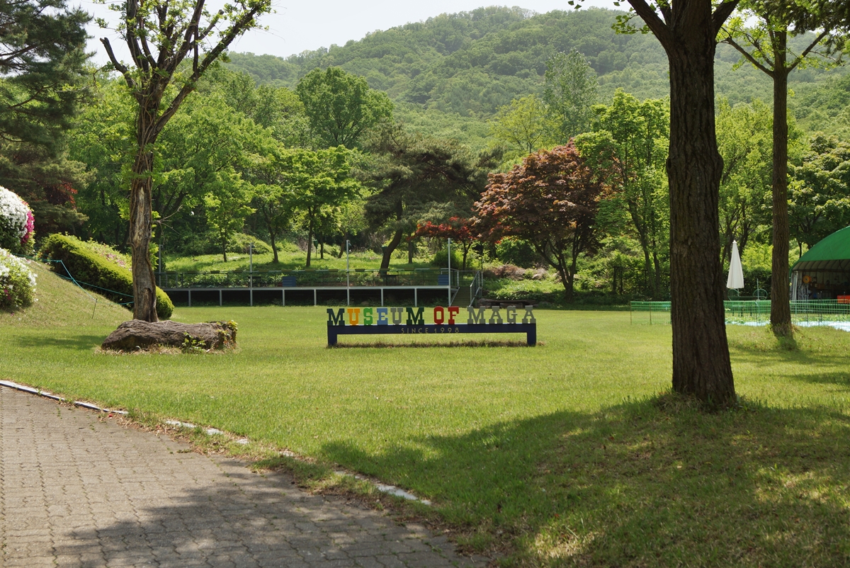 용인 마가미술관은 자연 속 미술관입니다. 1998년 섬유 미술관과 판화 전문 미술관으로 개관을 했습니다. 미술관 주변에는 경치 좋은 문수산이 자리하고 있습니다. 7월의 푸르름을 한껏 자랑하고 있습니다. 잔디밭 한가운데 'Museum of Maga'라는 글씨가 보입니다. 미술관이 아니라 깊은 산 속 전원주택 같은 느낌입니다.