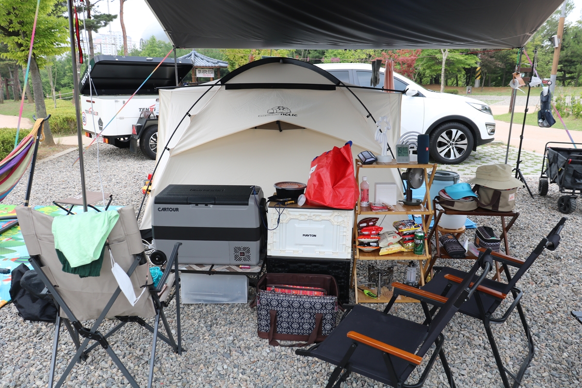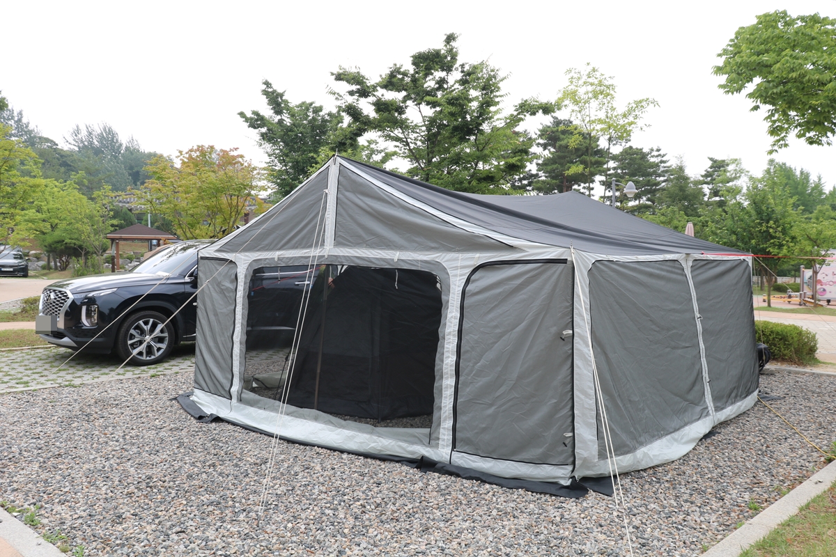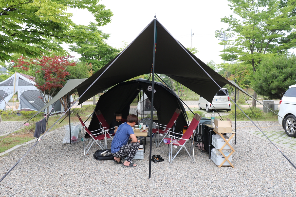 대형 타프도 보입니다. 타프 안에 조그만 텐트가 보입니다. 두 가족도 충분히 지낼만한 크기입니다. 요즘 캠핑 추세는 타프를 크게 하죠. 사이트에 따라 기준 인원이 다릅니다. A 사이트는 기준 인원 6명 + 추가 3명 등 최대 9명, B 사이트는 기준 인원 8명 + 추가 4명 최대 12명입니다. 애견은 동반 금지입니다.
