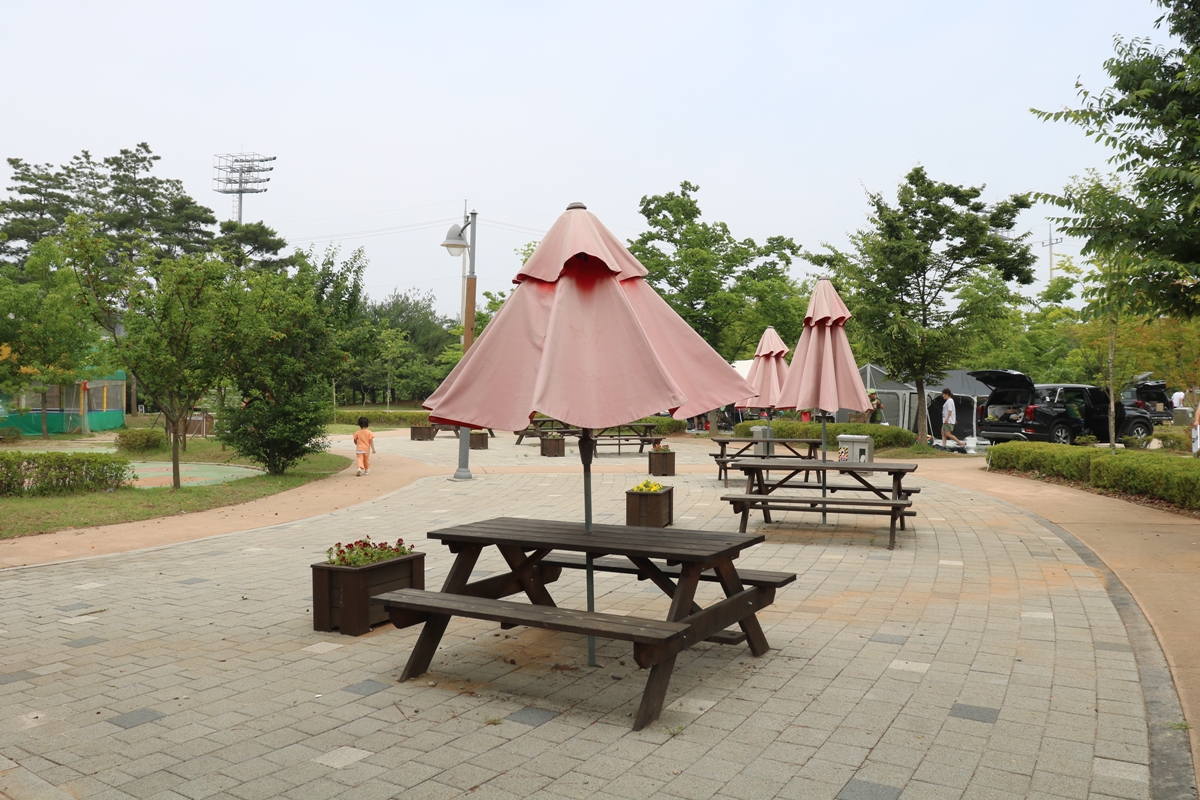 캠핑장 한쪽에 파라솔과 벤치가 있습니다. 제가 갔던 날은 흐려서 펼치지 않았는데요, 햇빛이 강할 때 펼쳐서 이곳에서 가족과 함께 쉴 수 있습니다.