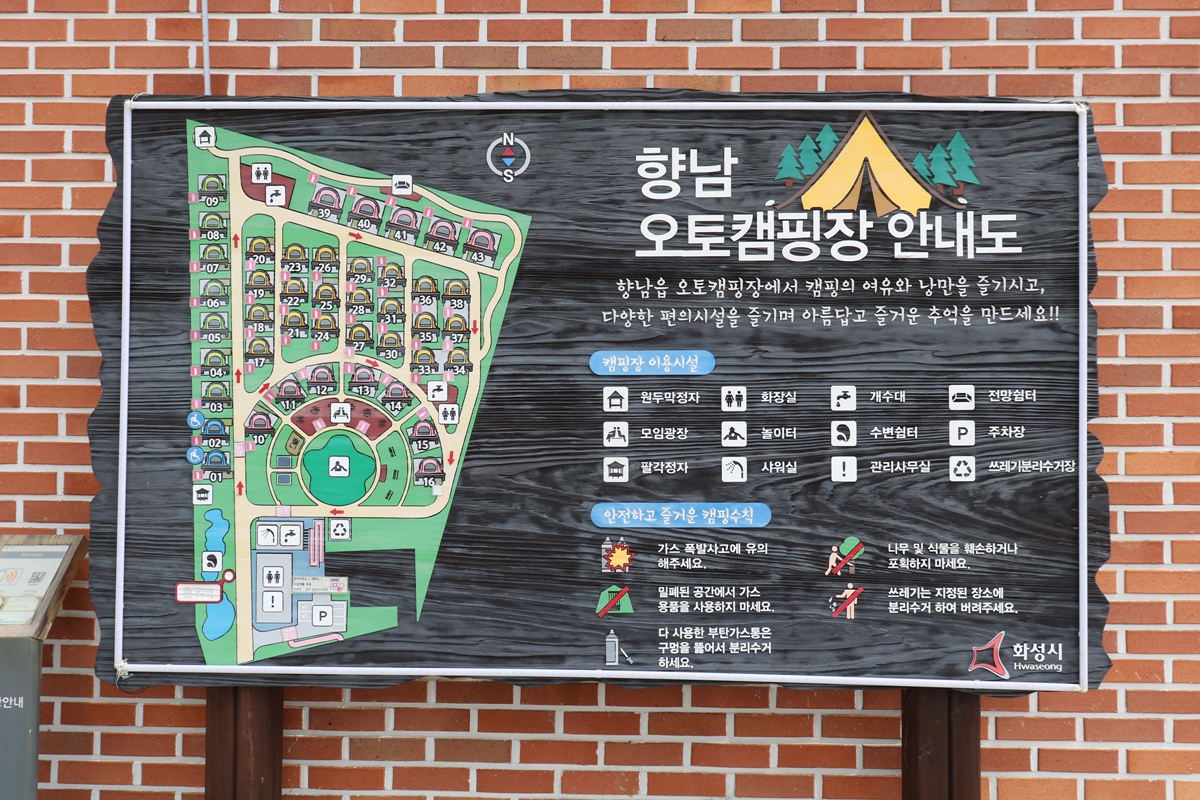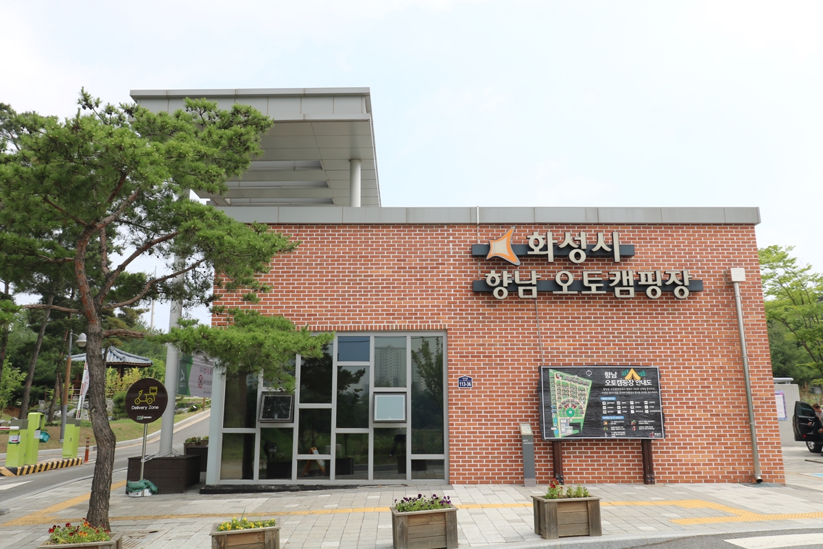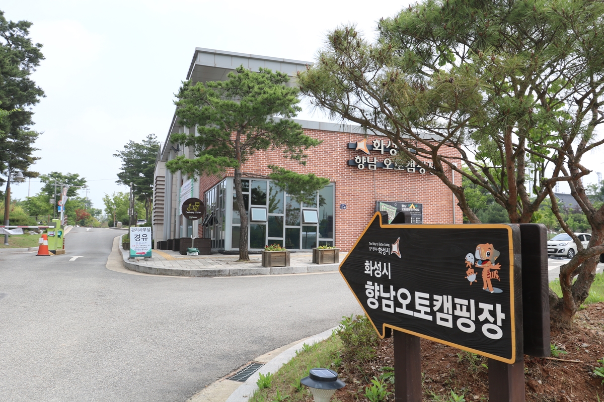 향남오토캠핑장은 화성시 향남읍에 있습니다. 내비게이션 이용 시 ‘화성종합경기타운 5주차장’을 검색해서 오시면 좌측에 빨간 벽돌 건물이 보이는데요, 이곳이 관리사무실입니다.